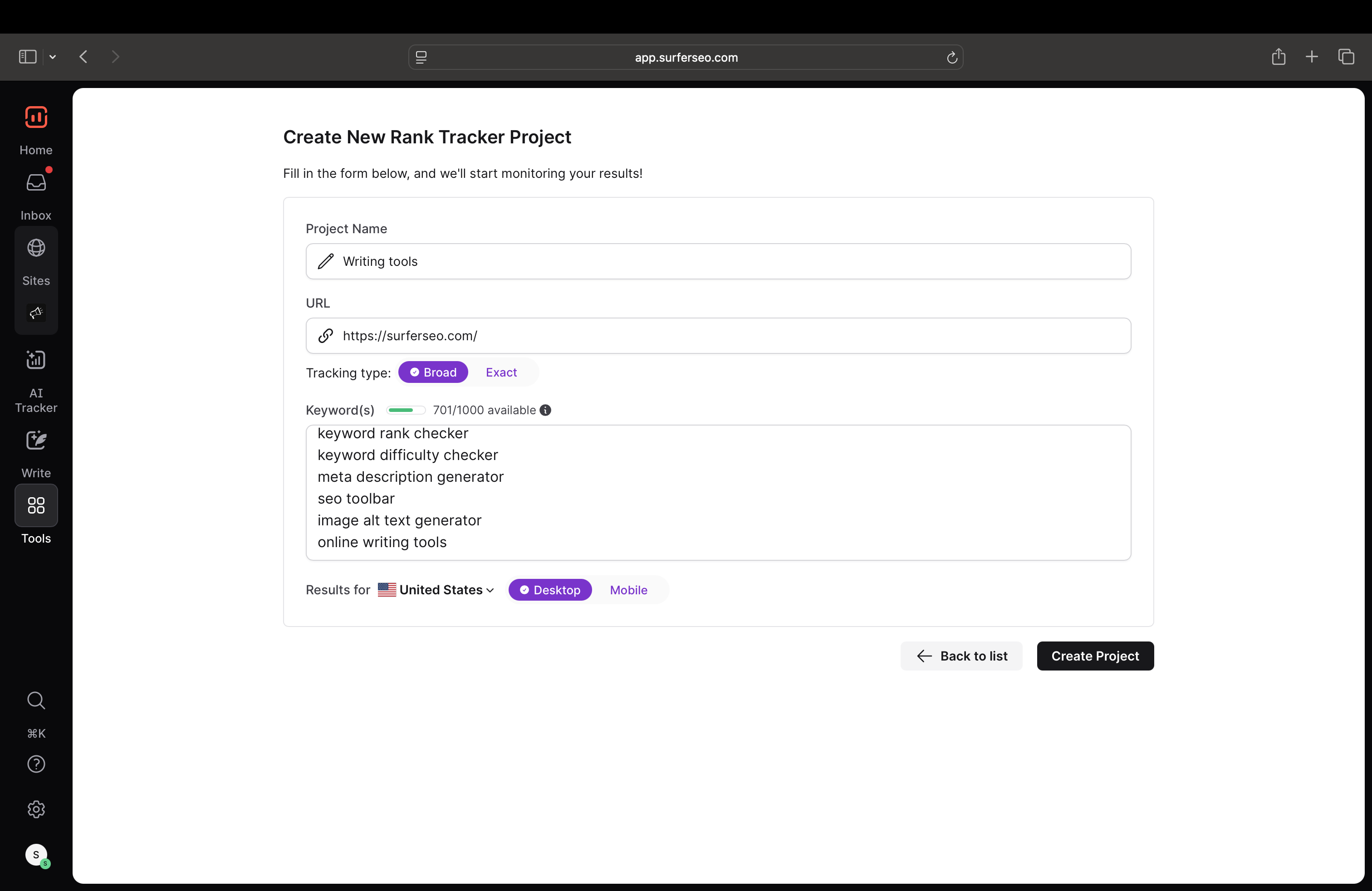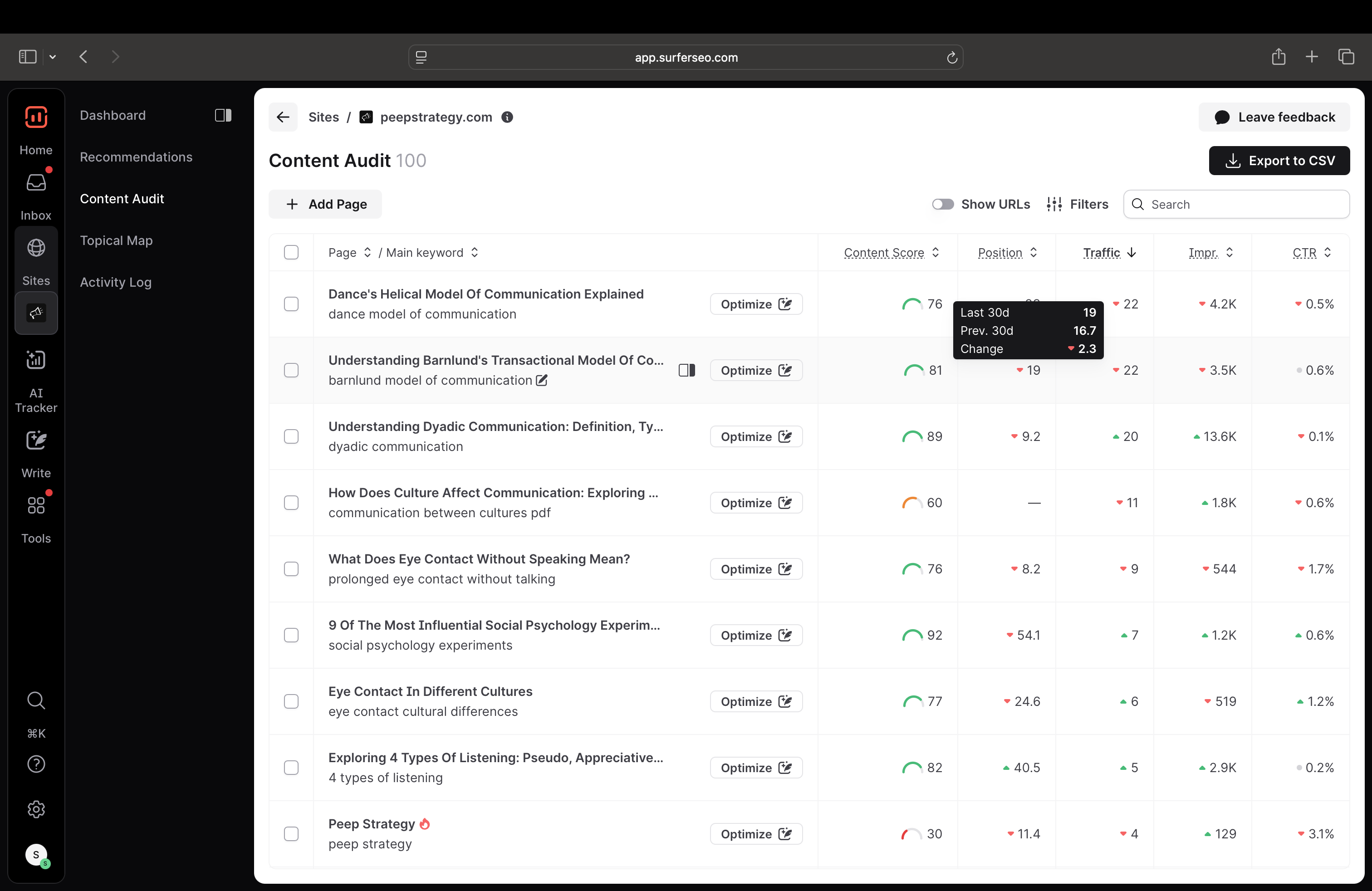 During that time, monitor your keyword rankings with a tool like Surfer’s Rank Tracker and watch for stabilization.