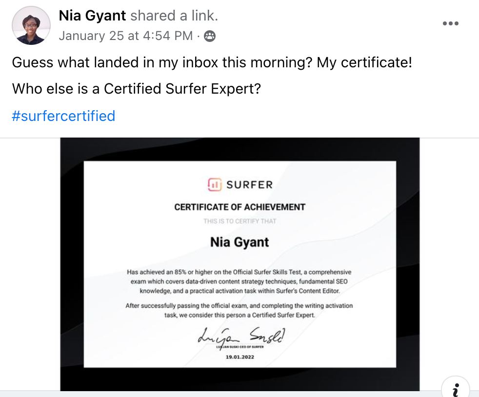 All you need to do pass the exam with 85% or higher, and complete the practical activation task of writing a blog post of 1500 words within Surfer's Content Editor! If you're successful, we'll send you an official Surfer Certificate that you can share, and a badge for Linkedin!