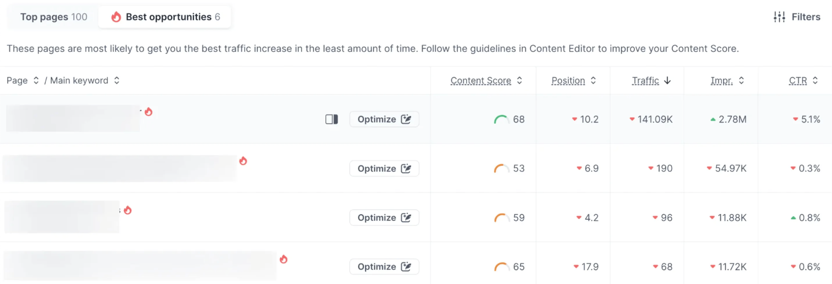 Inside the Content Audit, you can track the performance of your pages and find the top improvement opportunities.