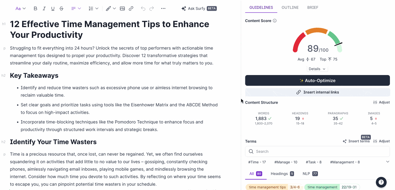 With an AI content writer like Surfer AI you can have a fully researched and optimized article ready in just a few clicks.