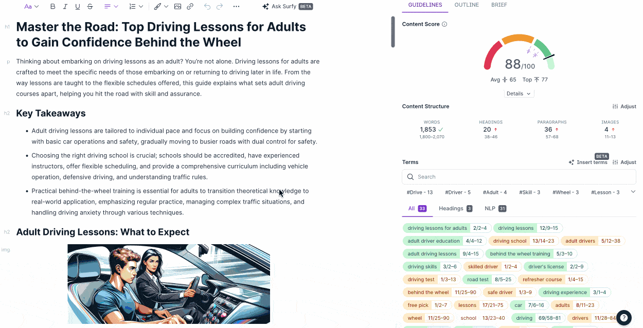 With Surfer at your side, guesswork becomes a thing of the past. It offers a wealth of keyword data for informed decision-making, and its Content Editor provides clear instructions for optimizing your content.