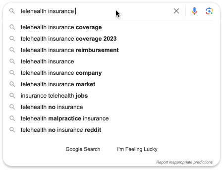 You could enter "telehealth insurance" into Google and then cycle through the letters of the alphabet to find keywords that may be relevant to your startup.