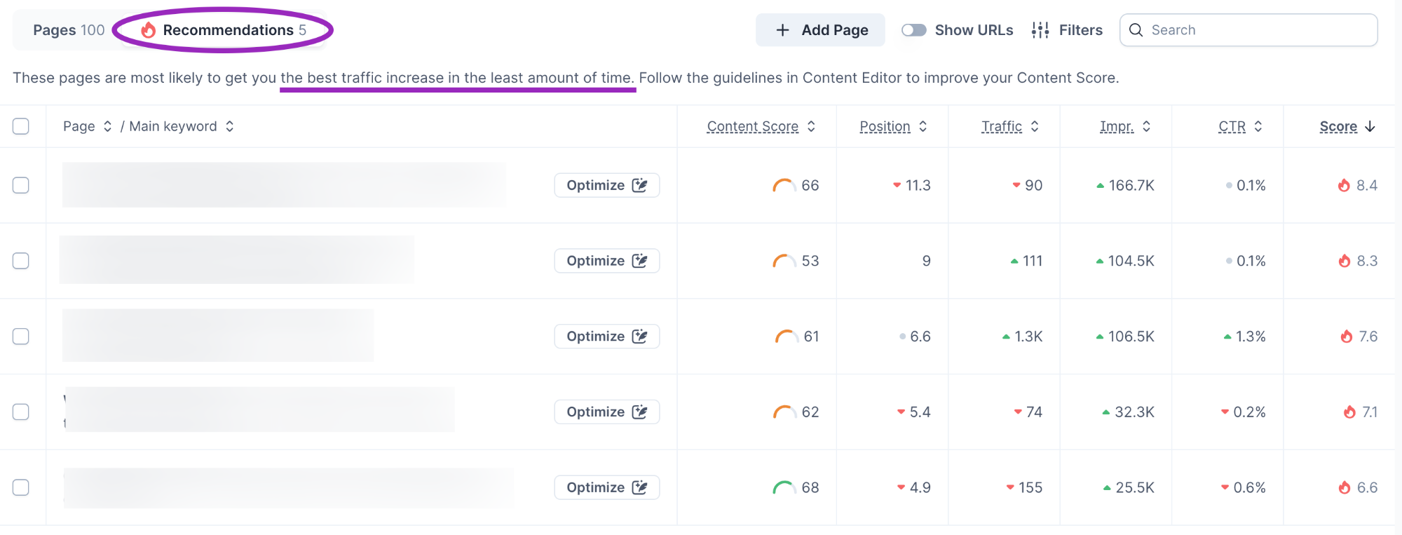 Surfer's Content Audit highlights these pages for you in the 🔥 Recommendations tab.