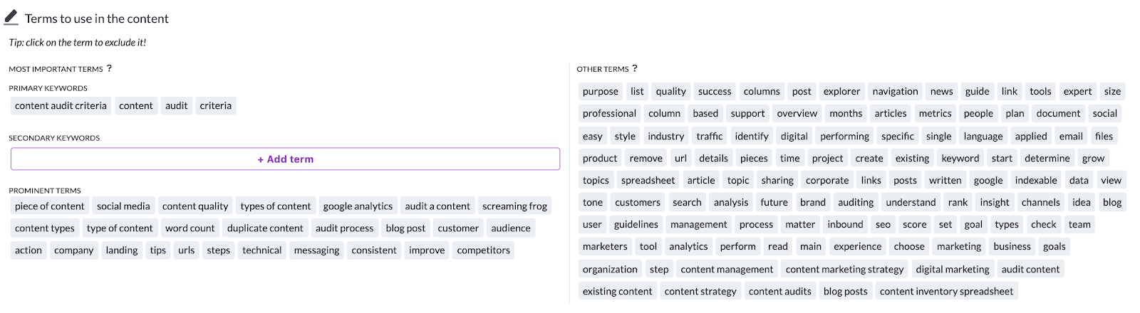 If you’d like to see exactly what data you get with this feature, here’s the exported Audit for this page. Once you create one for your keyword, you can freely share it with the outside world with a link.