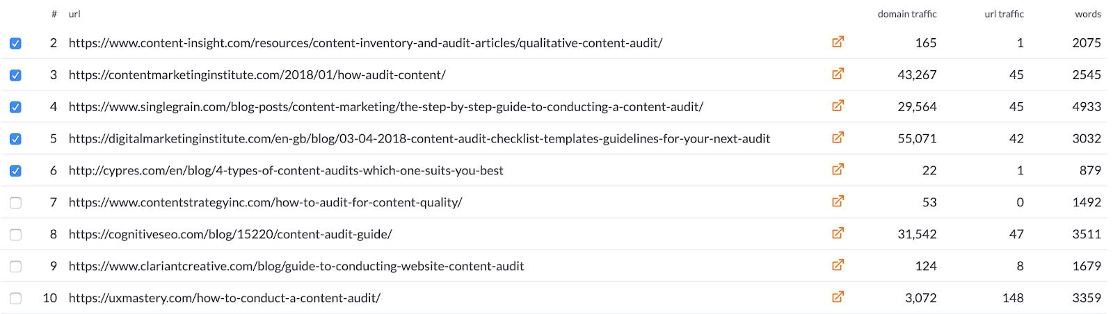 For my keyword “content audit criteria” for the UK, there are mostly articles, so I get relevant data on their word count. If your blog post is below those numbers from top positions, it’s time to sit down and write!