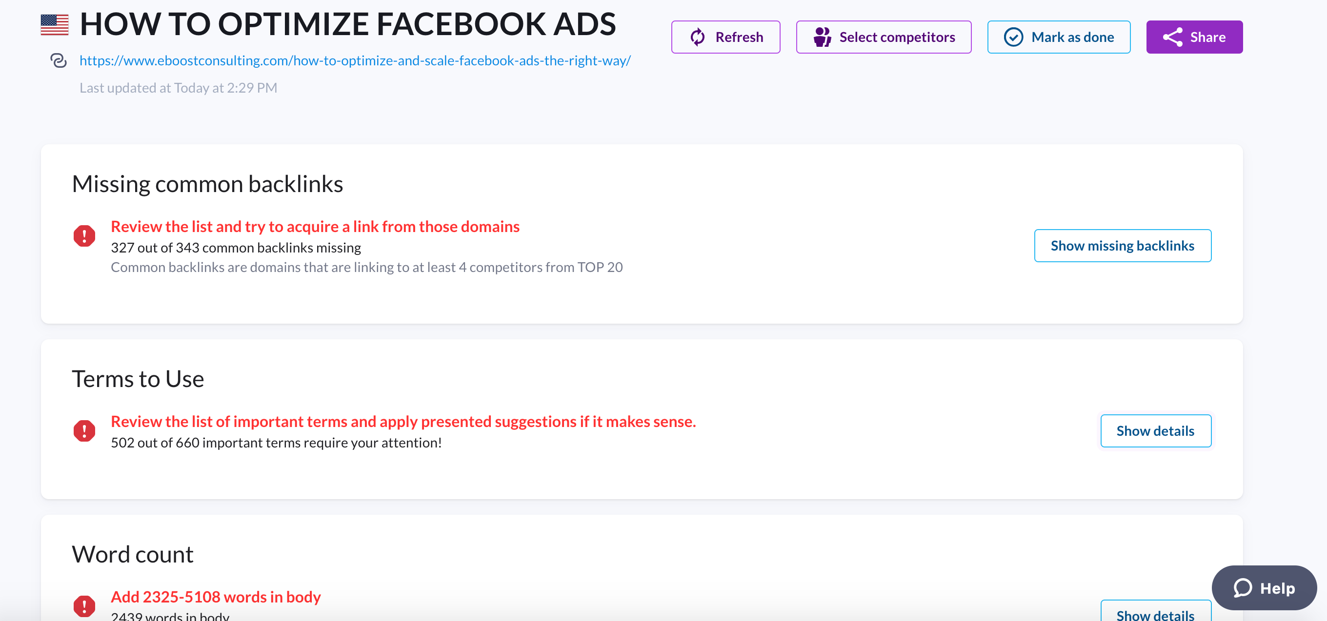 What you need is a list of terms and their frequency. Once again, you’ll need to analyze organic competitors to find out what words are the most powerful for your keyword. You may do that manually, but it’s a prone-to-error task.