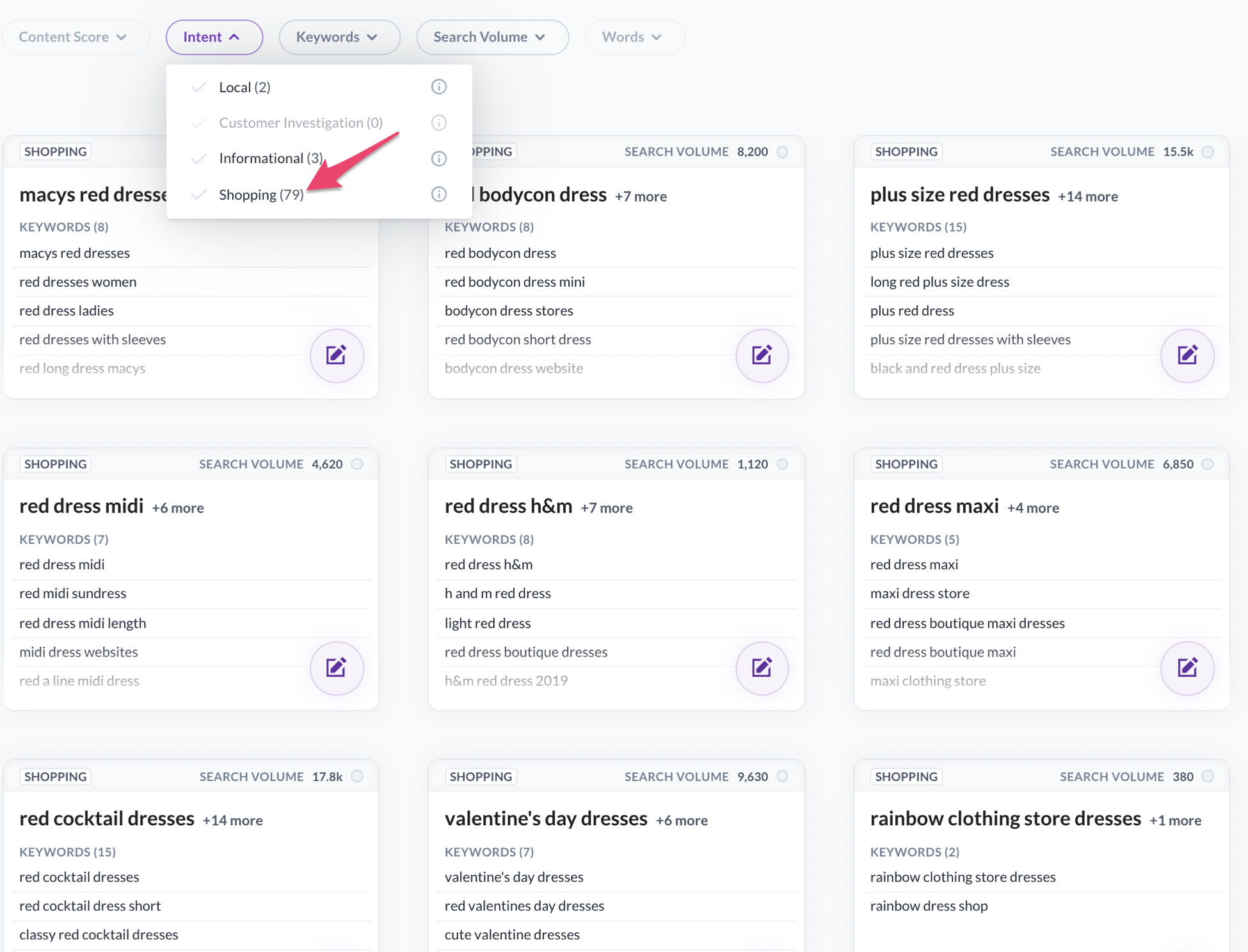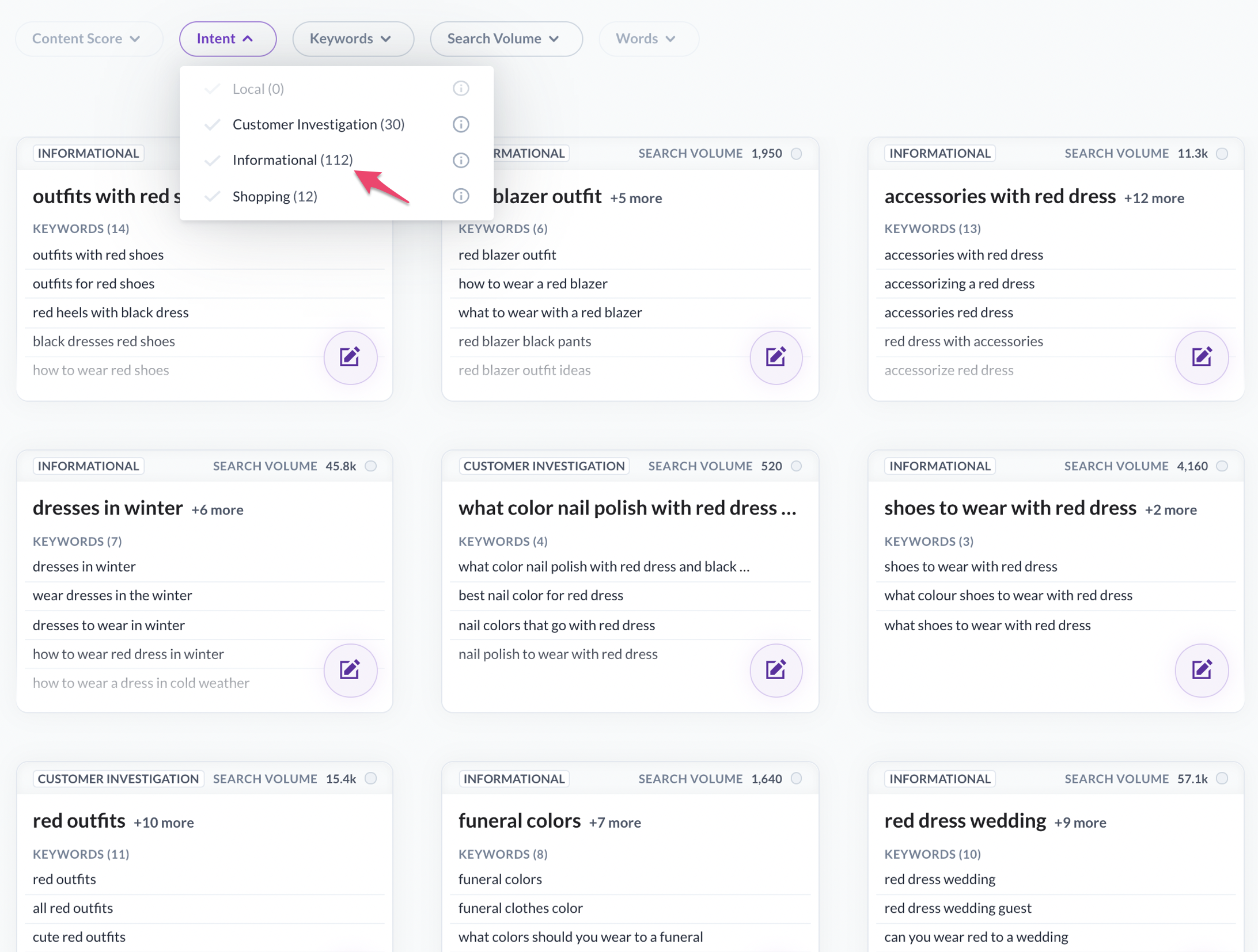 These topics are great for expanding child categories in your store that will target precisely red dresses long tails. What else can be done to build topical relevancy and boost main category? Of course it is the blog. Creating a bunch of articles about red dresses can be beneficial thanks to internal links. But how to figure out the right topics for the blog? Thanks to using Machine Learning algorithms we can do it by providing the right seed keyword that has clear informational user intent.