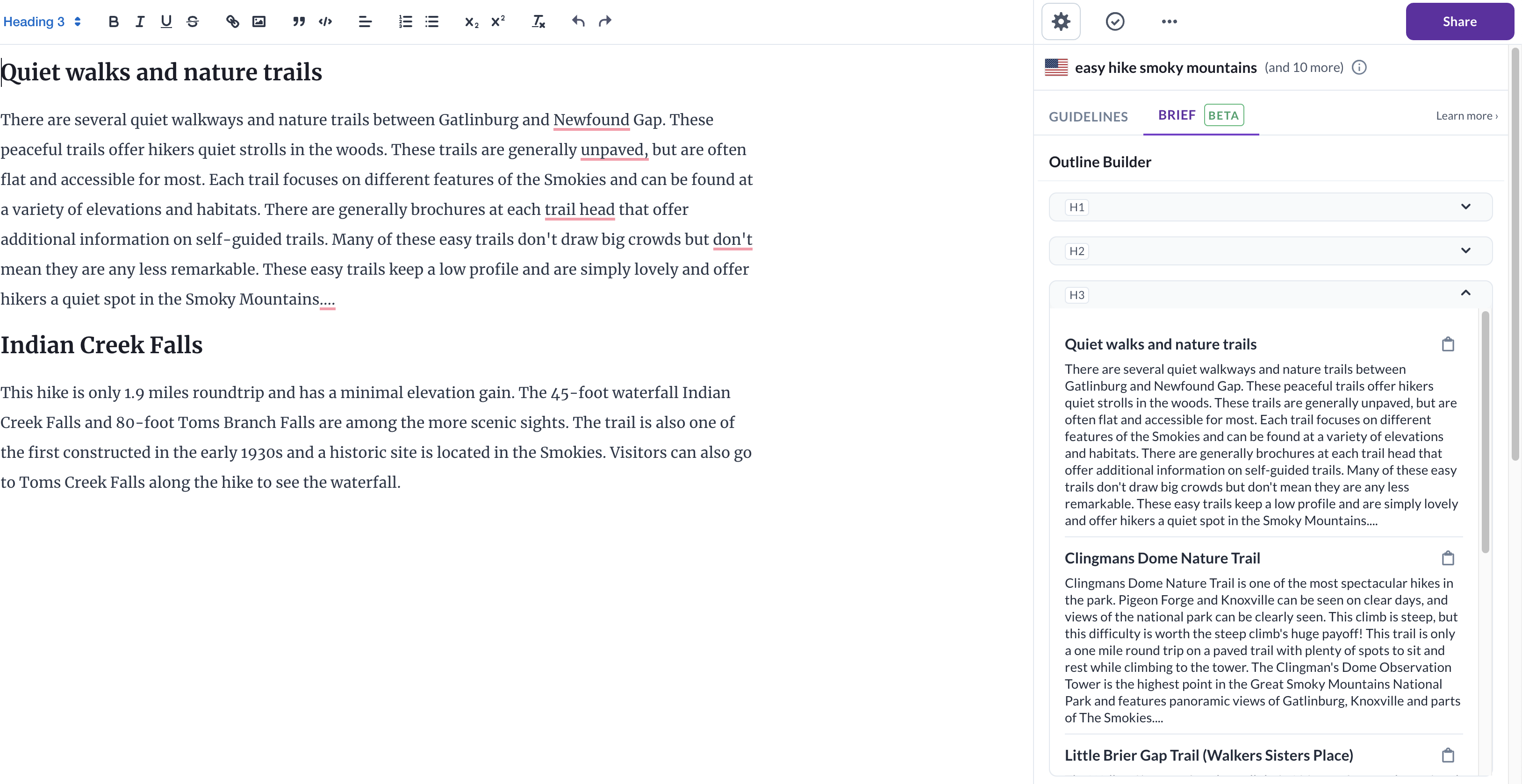 Content Editor's Brief uses complex machine learning algorithms in the backend that analyze and present common patterns in all the top-ranking search results. It will take competitors' content and summarize it, making sure you get the best TL;DR ever.