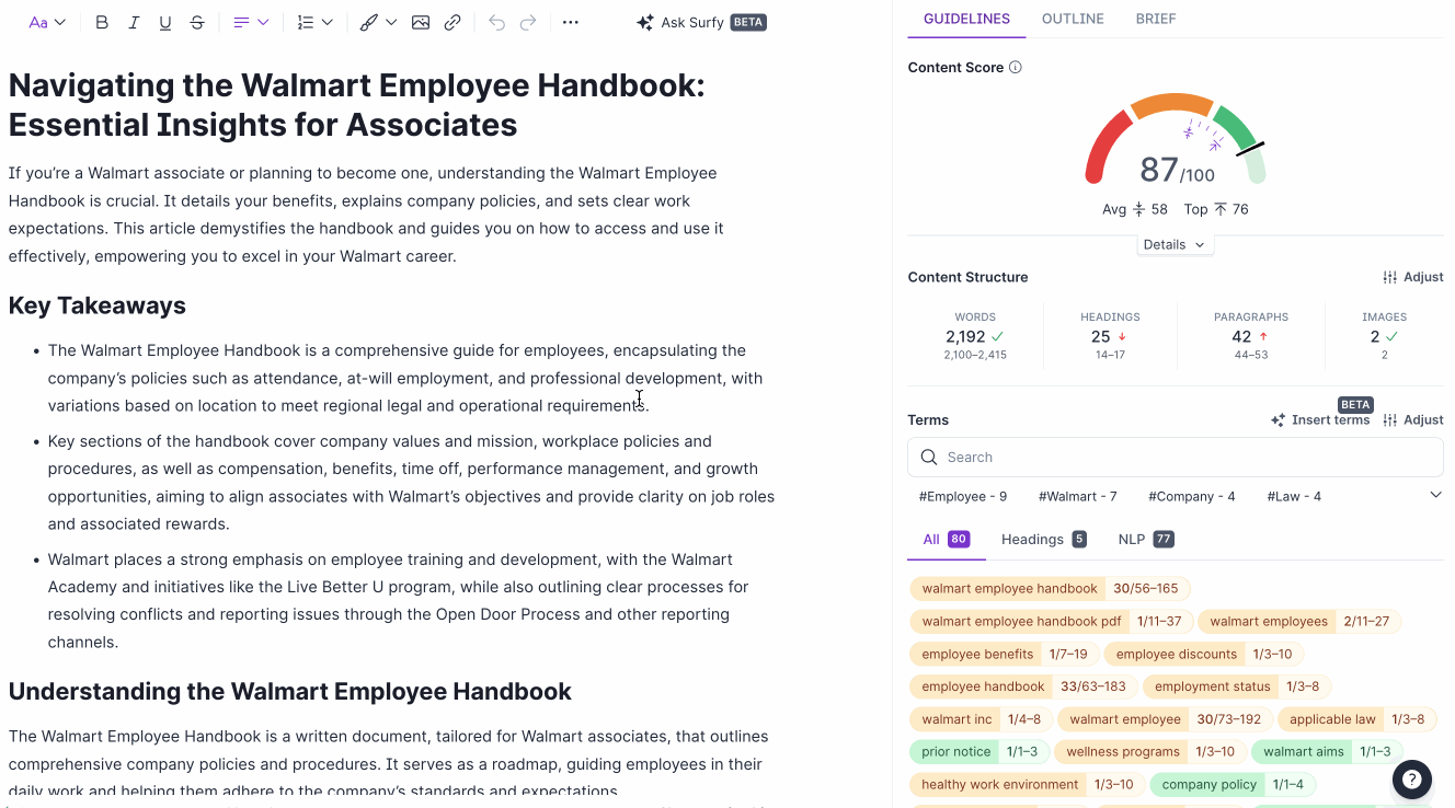 They created 200 articles in bulk for Fortune 500 company handbooks using Surfer's AI content generation capabilities.