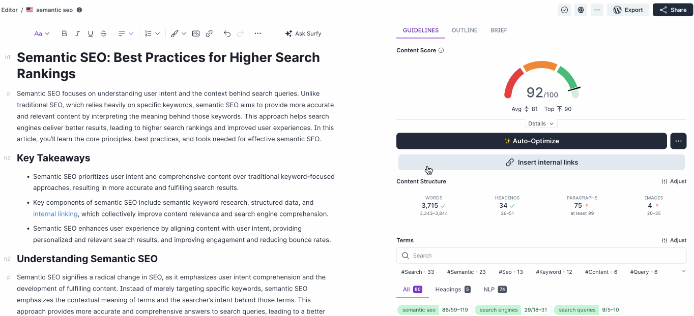 Click the "Insert Internal Links" button and Surfer will automatically select anchor texts and insert relevant internal links into your article.