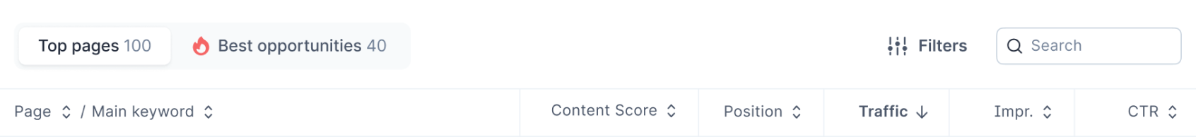 Content Audit analyzes your content and extracts essential metrics such as position, CTR, traffic, and Content Score.