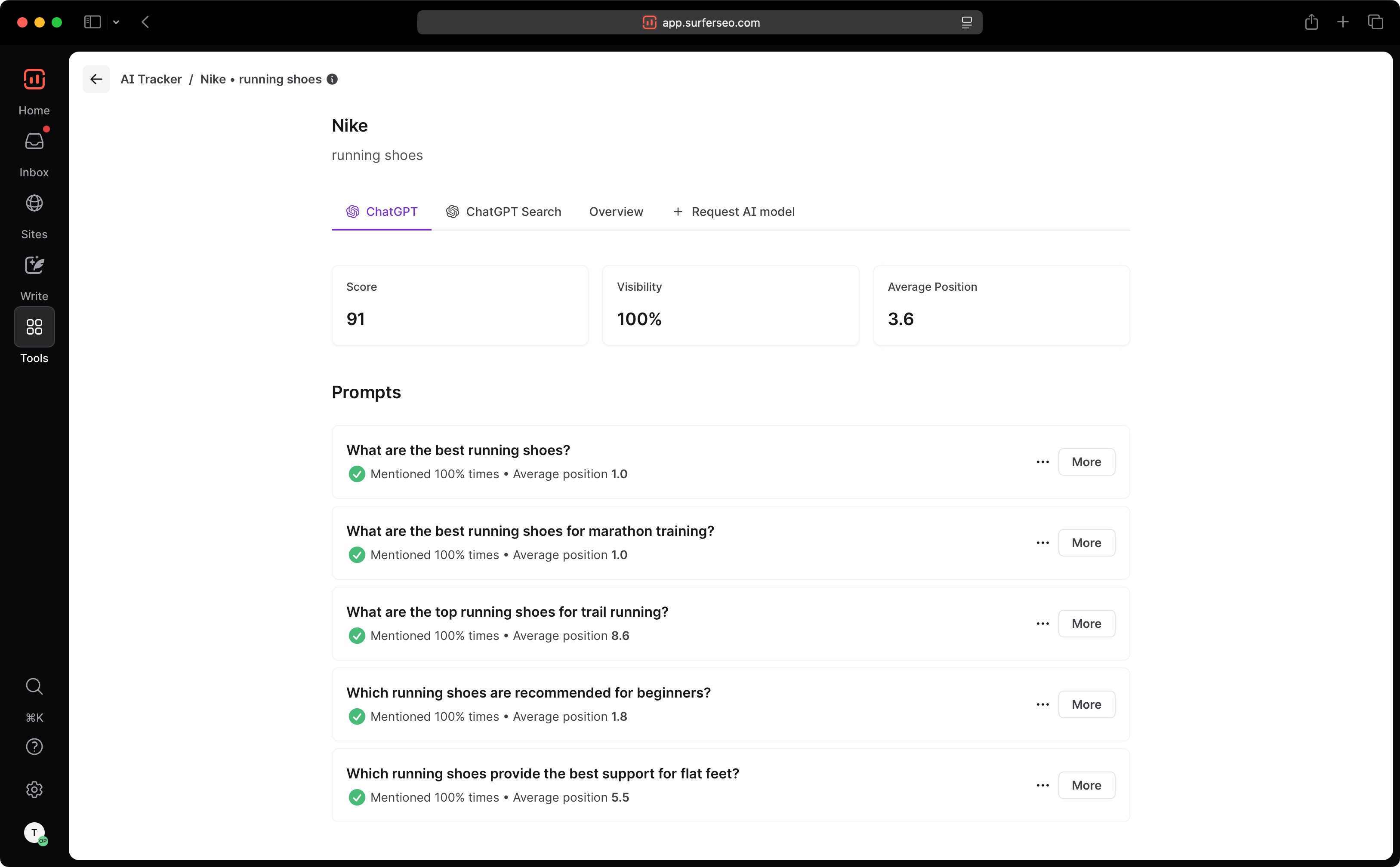 Built into Surfer as an add-on, AI Tracker monitors how often large language models (LLMs) like ChatGPT, SearchGPT, Google’s AI Overviews (soon also AI mode, Perplexity and others) mention your brand, products, or topics in AI-generated answers.