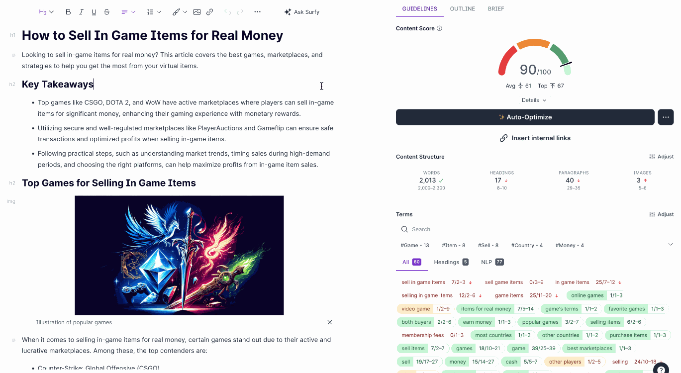 Here's an example of suggested NLP keywords for an article on how to sell in-game items for real money.