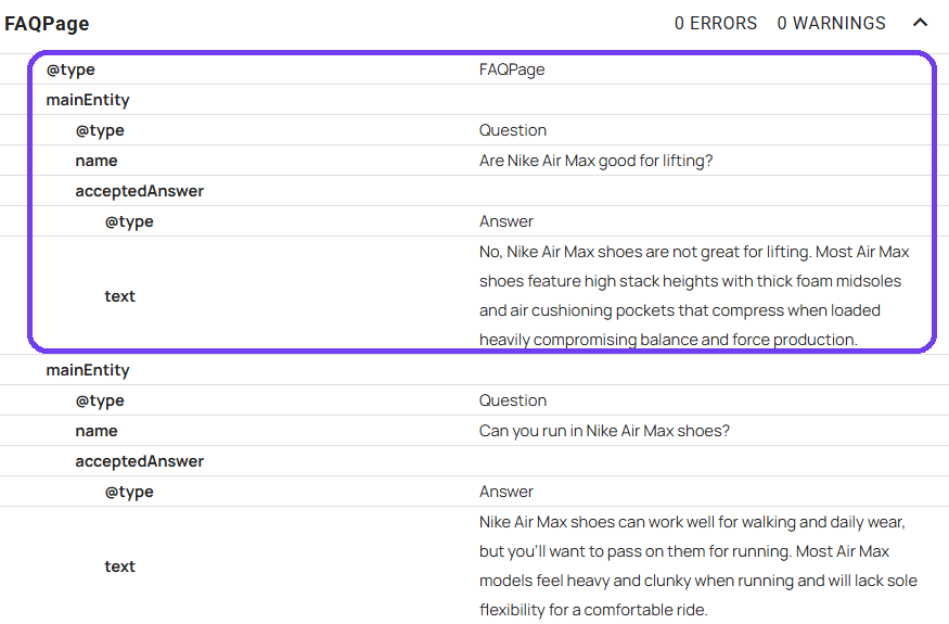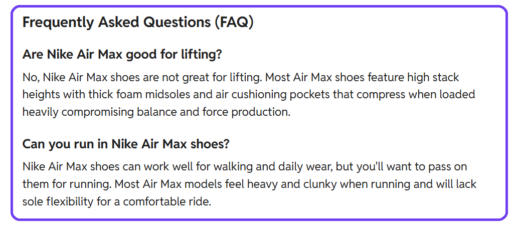Notice how the FAQ copy is an exact match with the one written in the Schema markup. And here's what happens if I Google "Are Nike Air Max good for lifting?"