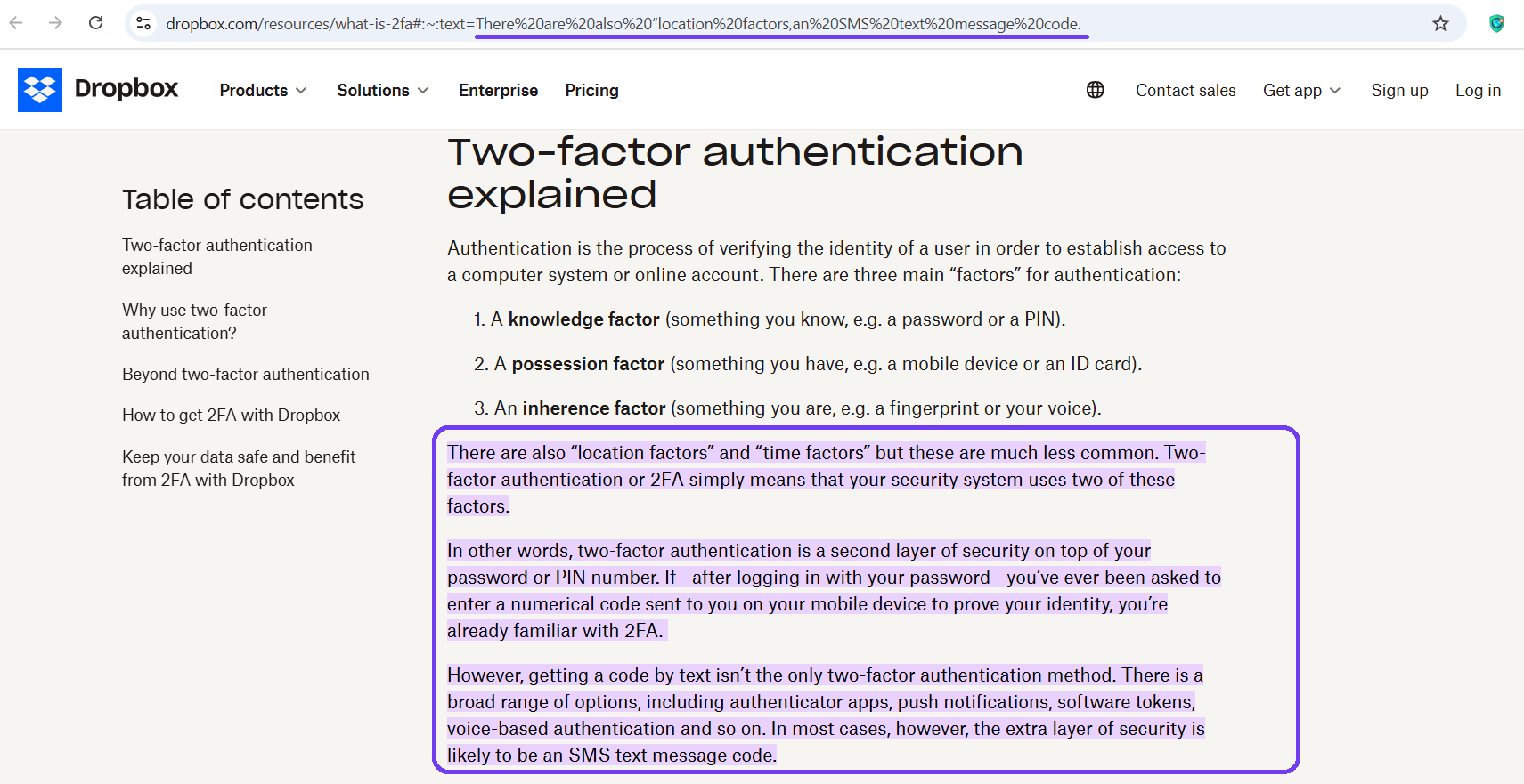 The text fragment I showed above is actually listed as a resource in AIO for the "What is two-factor authentication" search query.
