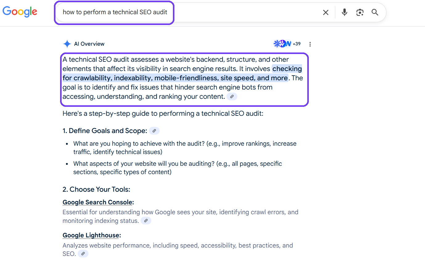 If you were to write a section about a complex topic, like how to perform a technical SEO audit, you should first start by explaining what technical SEO audits actually are or what they do—just like what AIO does here: