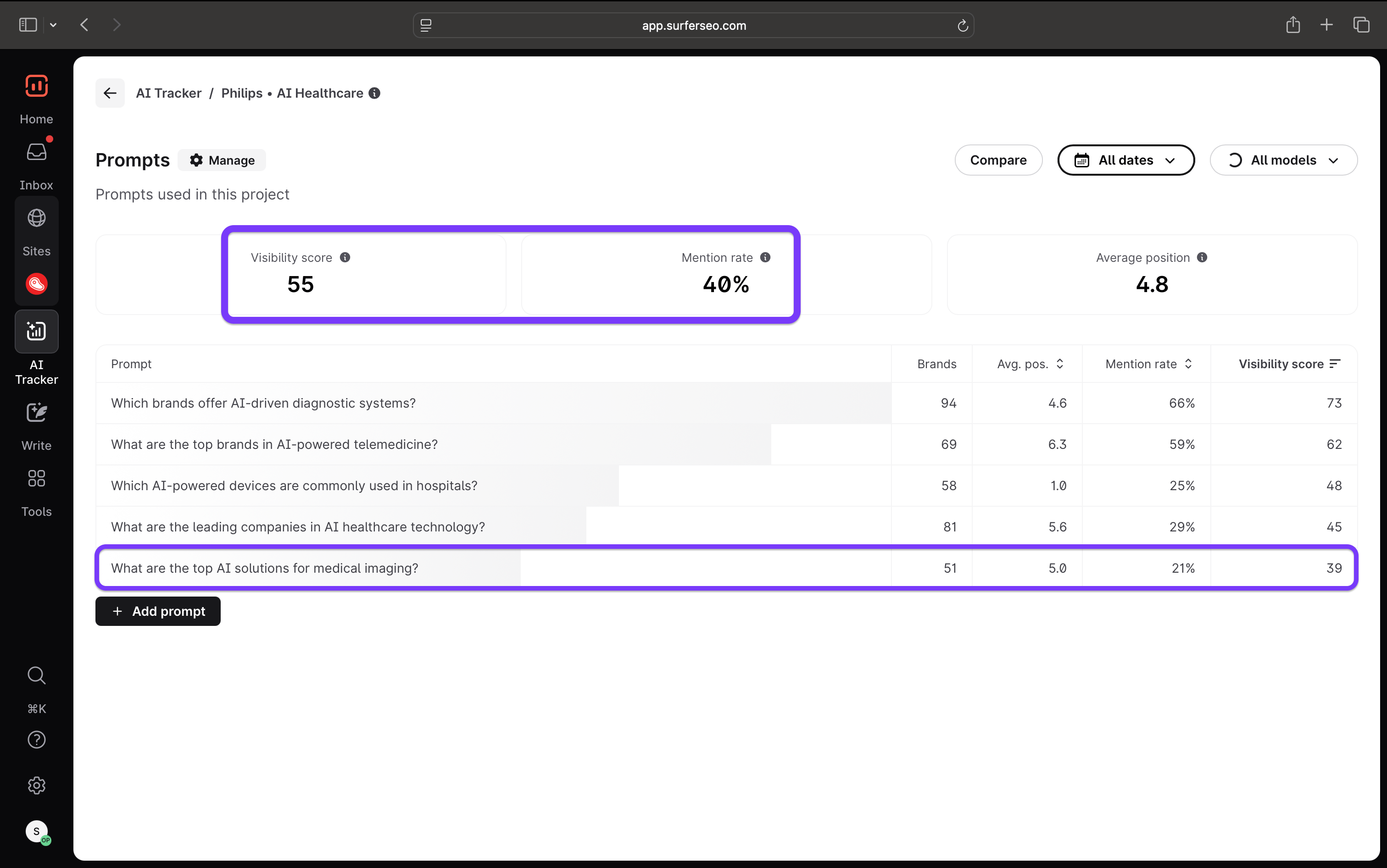 For example, using Surfer AI Tracker, you can see Philip's visibility in the AI healthcare space. Their visibility and mention scores aren't very high.
