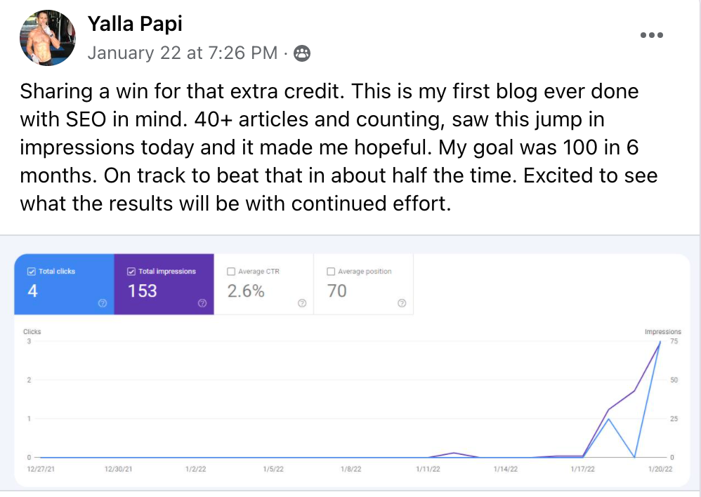 That said, don’t be discouraged! There’s no one formula, nor are there any hard rules as to when a post will start showing results. This is a post from SEO Surfers, Surfer’s private interactive Facebook community!