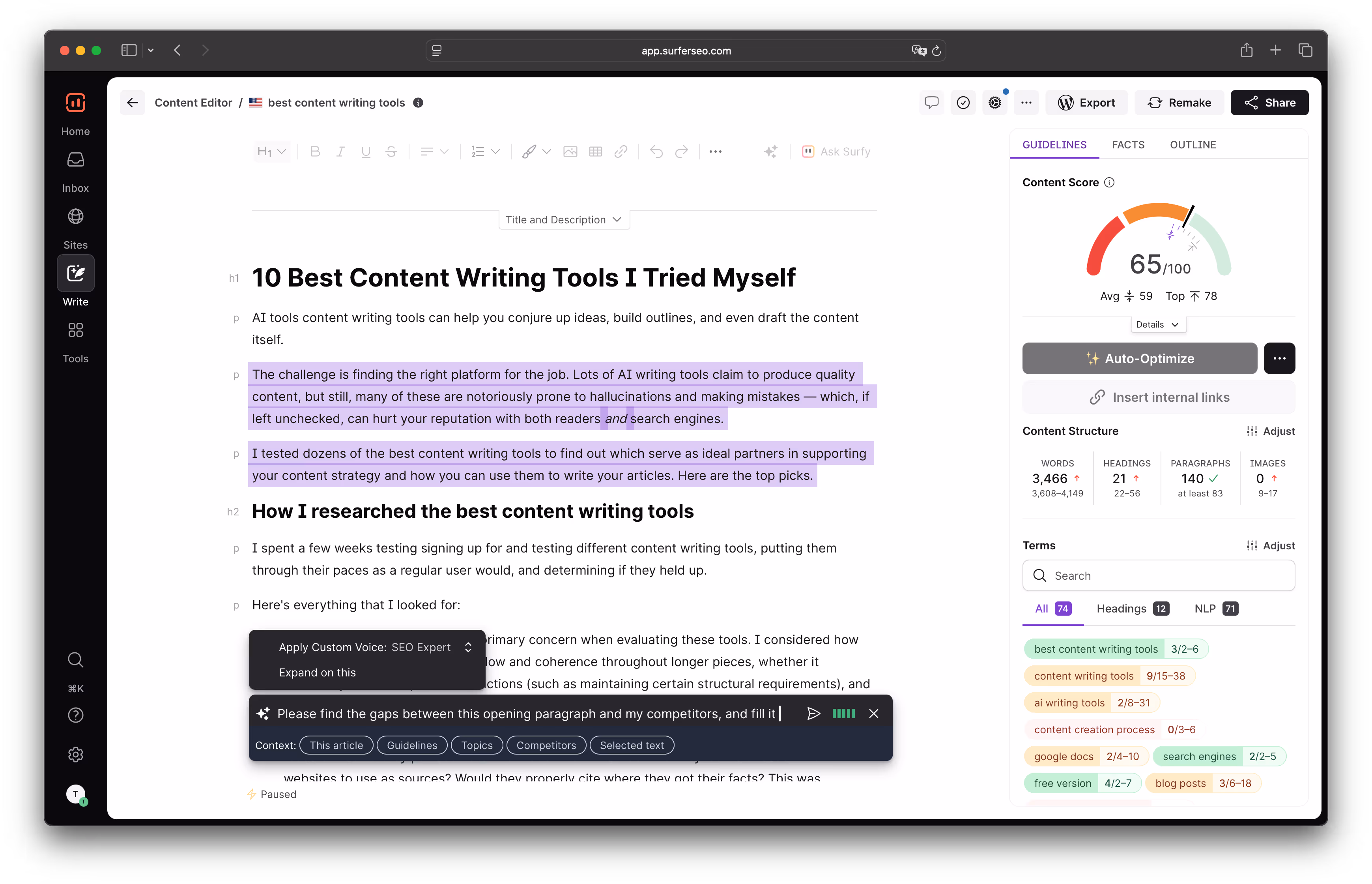 My favorite way to use Surfy? Ask it where your content lacks something compared to competitors, and then request to fill those gaps for you.