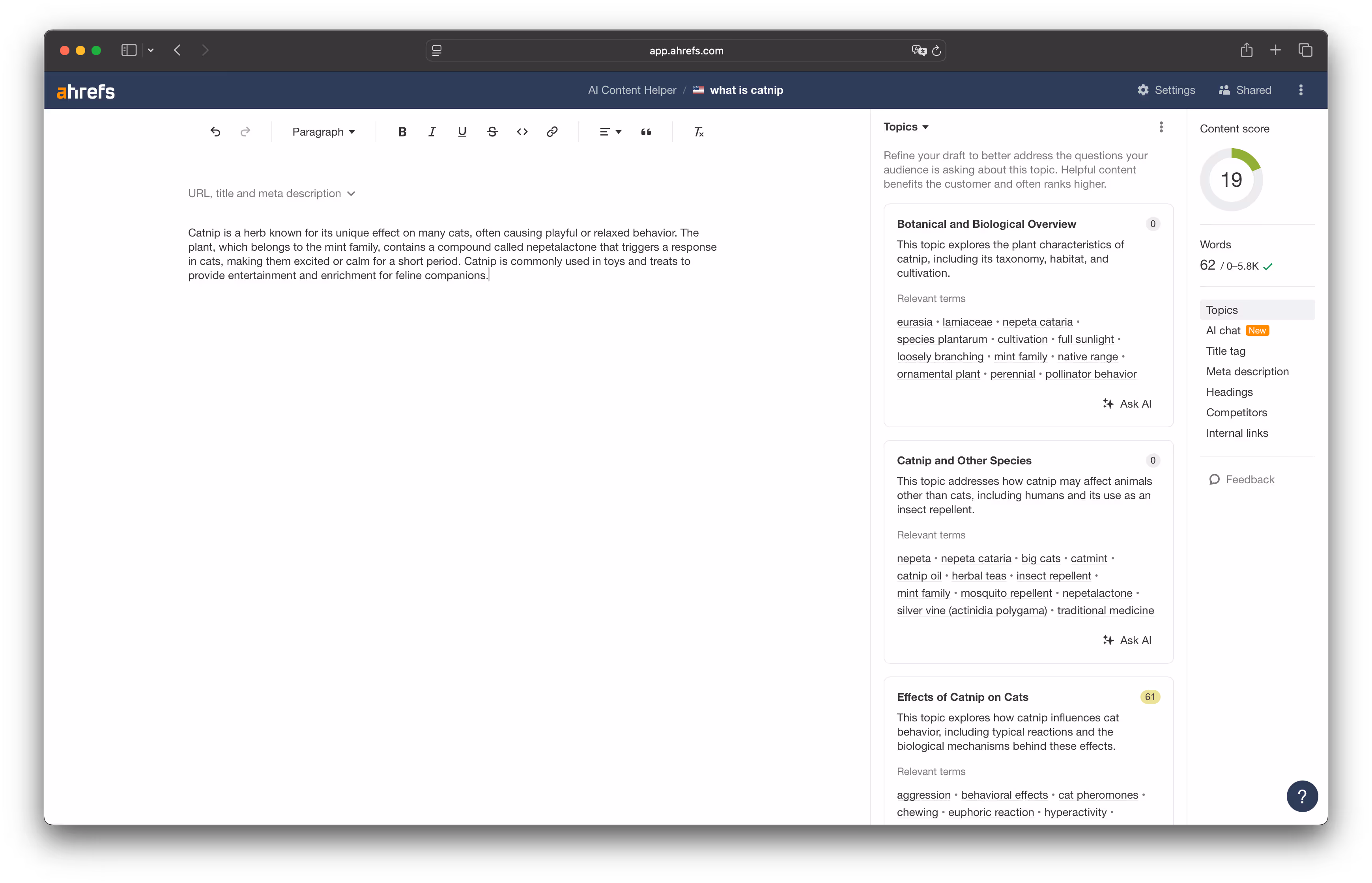 Compare that to Ahrefs, which only recently entered the content space with their AI Content Helper.