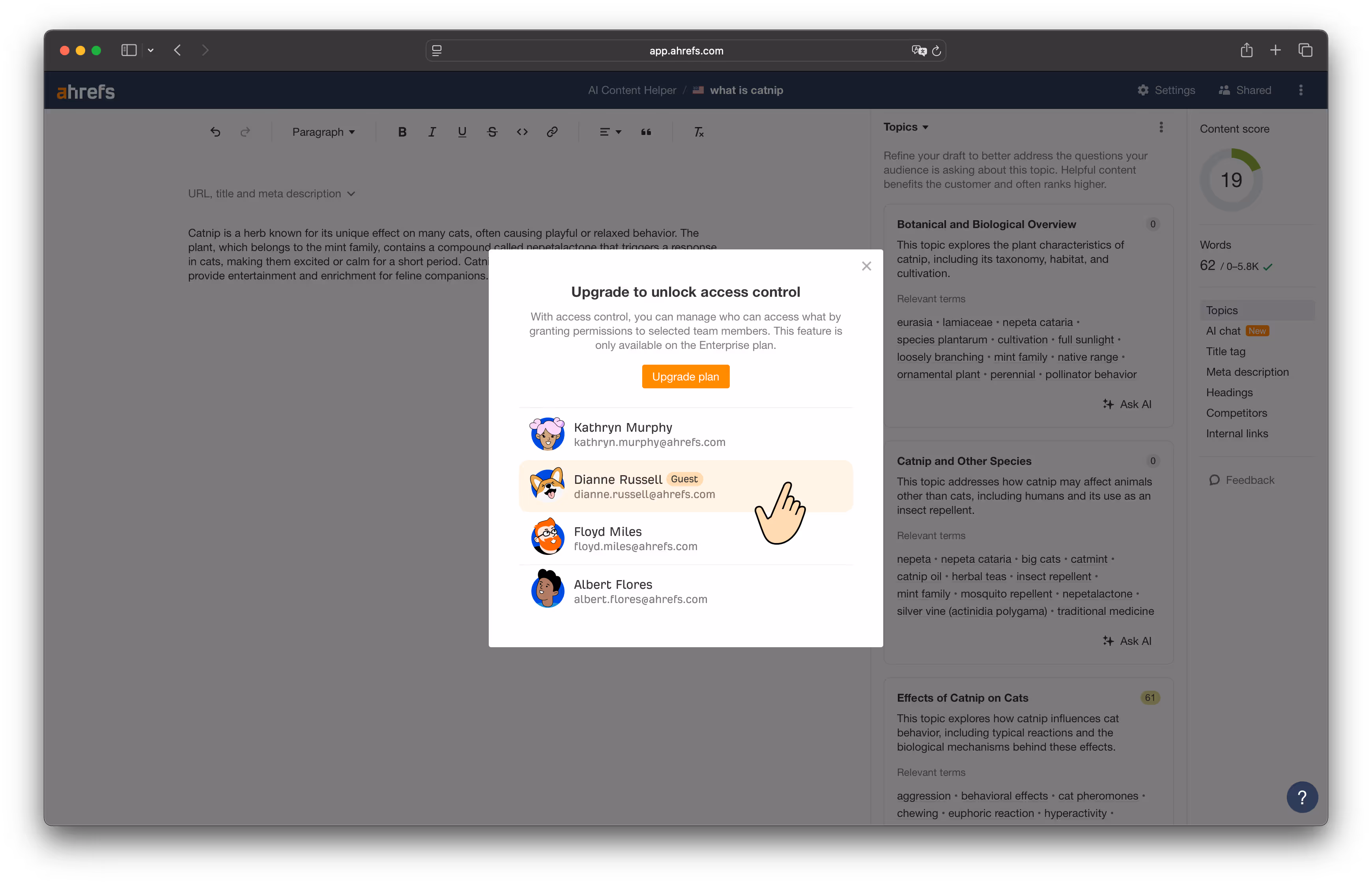 - Collaboration is free. Shareable links, WordPress and Google Docs integrations, and team workflows are all built-in–without charging you for more seats (as Ahrefs does).