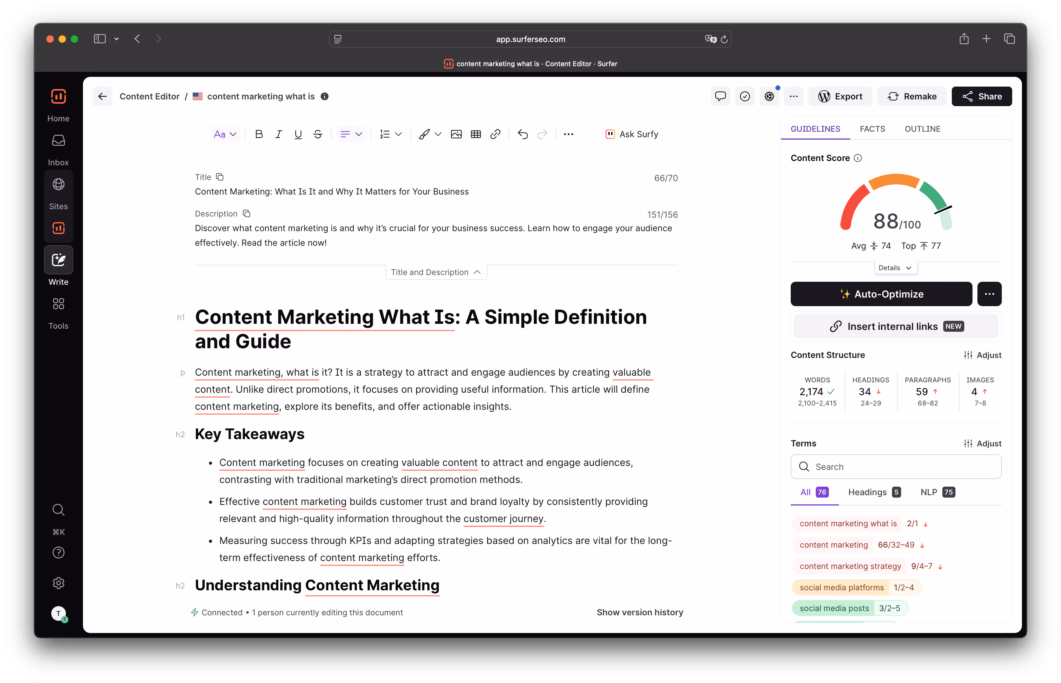 Surfer is built for SEO from the ground up. Every Content Editor you create starts with a live scan of top-ranking pages for your keyword.