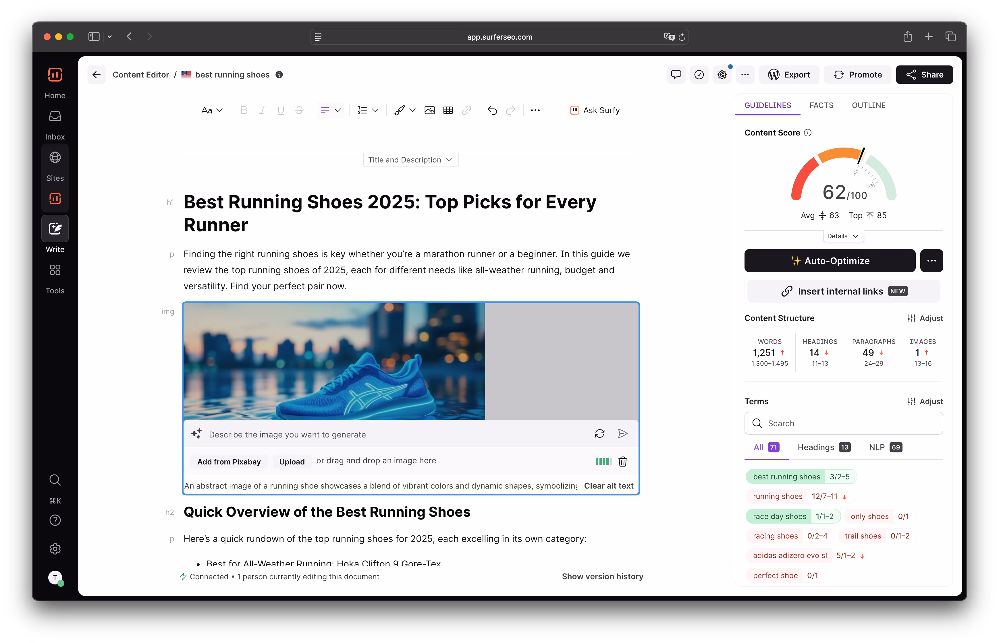 Surfy doesn’t just generate text. It helps you create content that ranks.