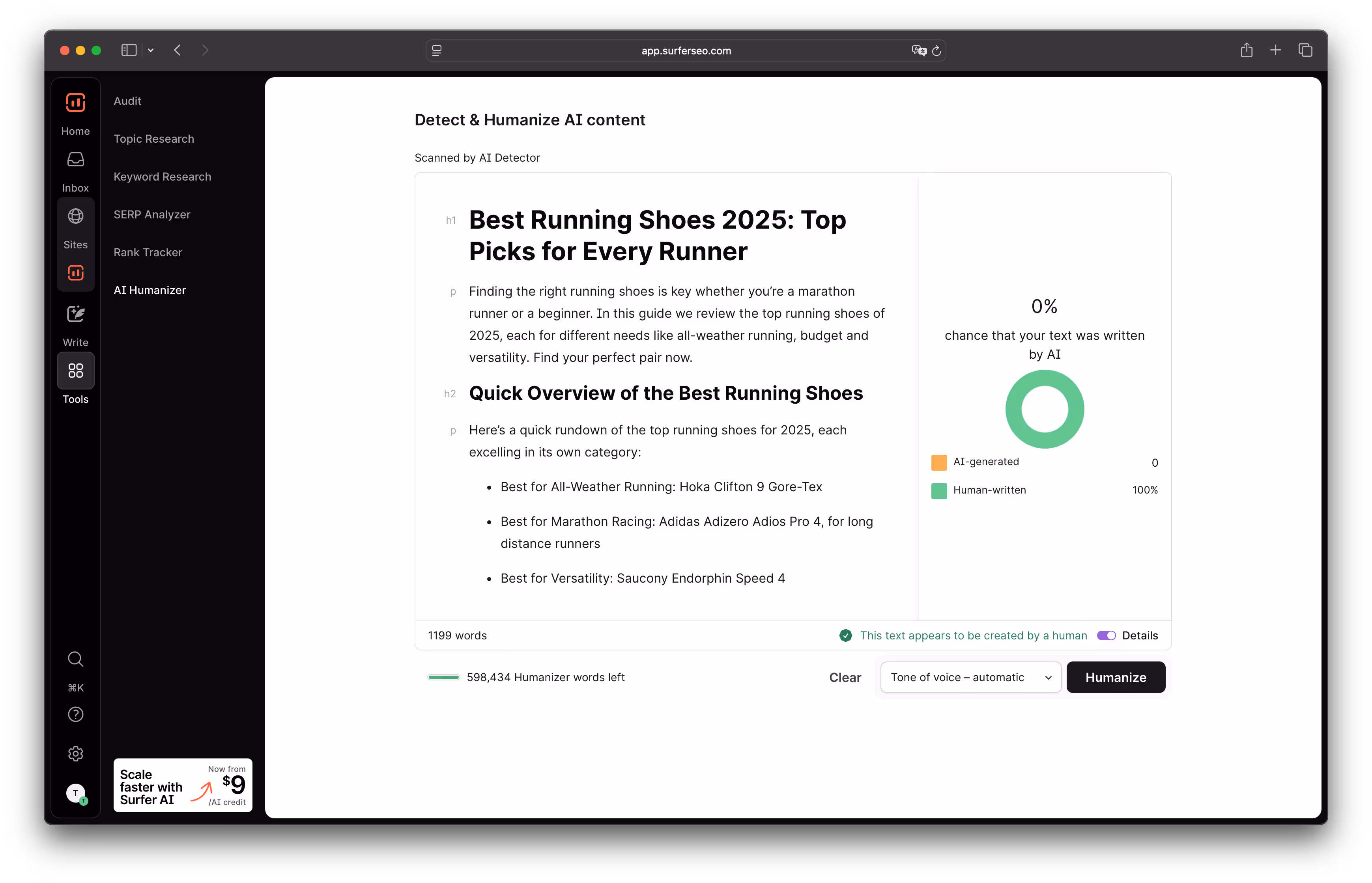 Bonus: Surfer’s content often passes major AI detectors like Originality.ai–not because it’s “hiding” the AI, but because it actually reads like a person wrote it.