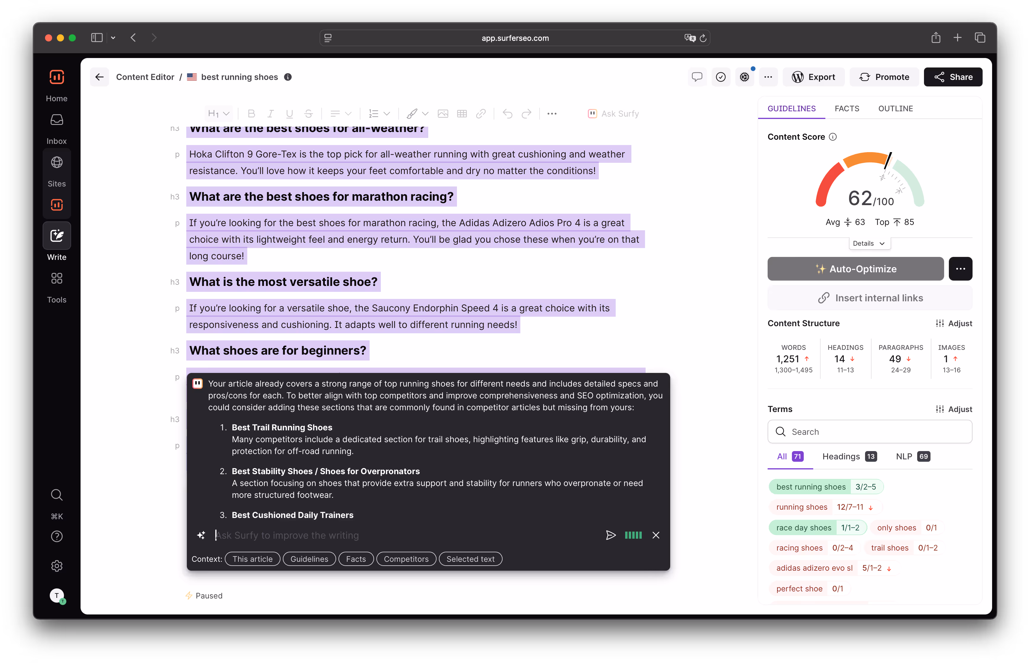 When you ask Surfy to rewrite a paragraph or expand a section, it pulls in real data–about your competitors, your site, and what Google is rewarding.
