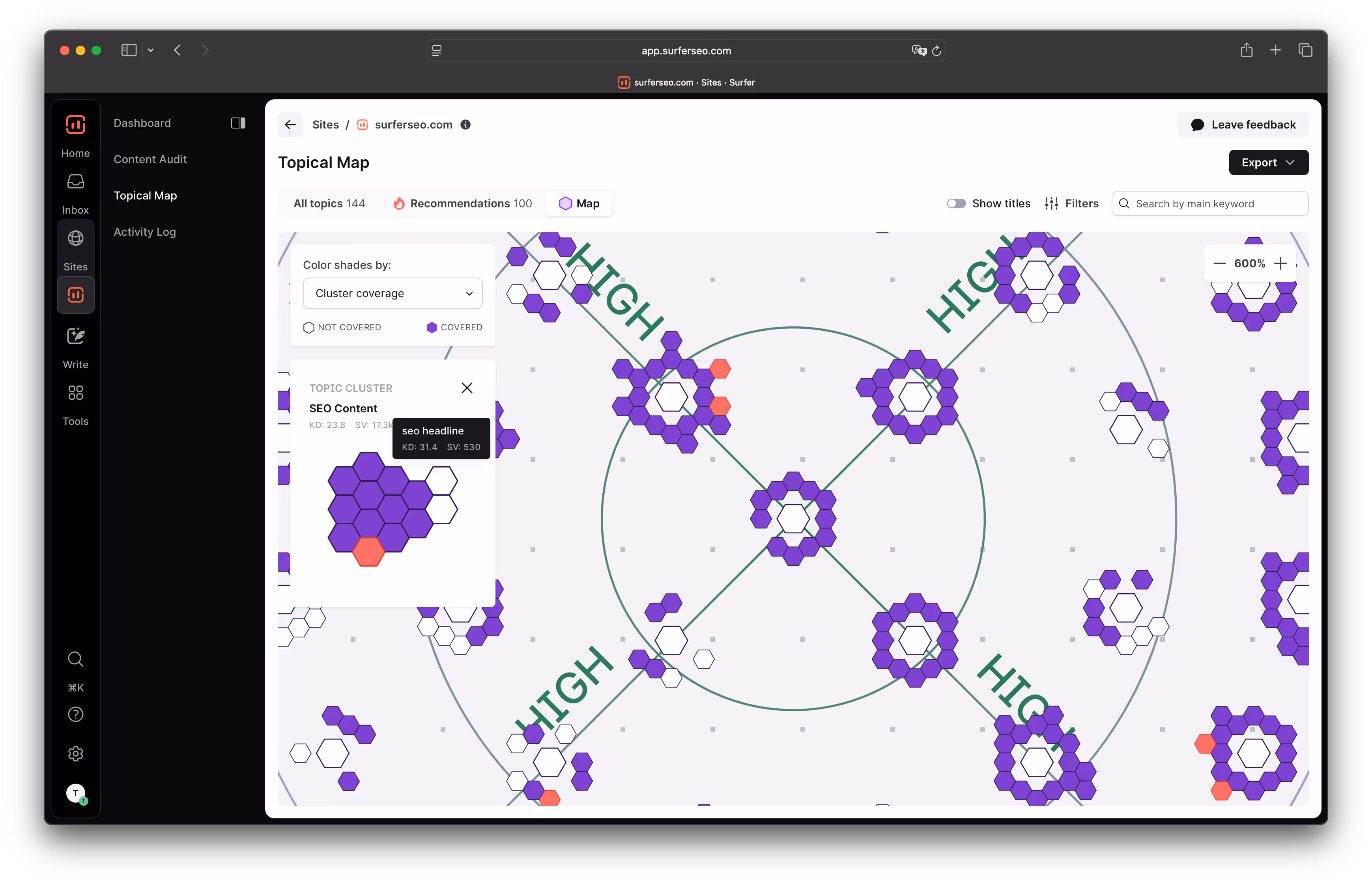 Surfer’s Topical Maps give you a clear, strategic view of your content landscape. You’ll see what topics you’ve already covered, what’s missing, and how everything connects.
