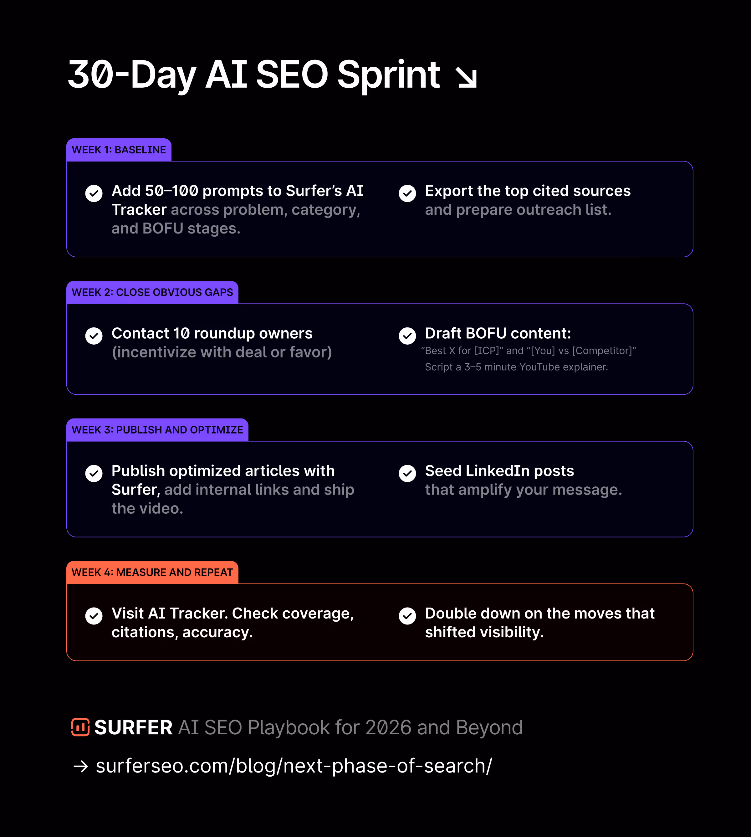 Here’s the exact system we run at Surfer to win visibility inside AI answers. Think of this as a practical chapter you can follow step-by-step.