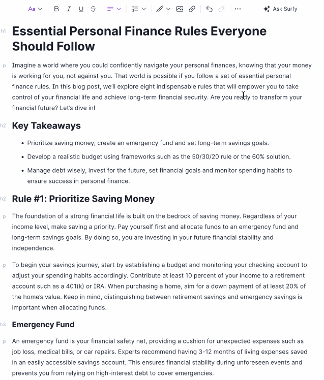 Here's an example of an article I wrote with Surfer AI on "personal finance rules" in about 20 minutes.
