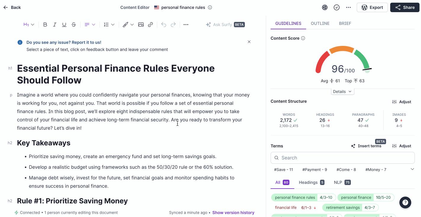 The AI text generator optimizes your article in Surfer’s Content Editor, where you can see the content score and which secondary and related keywords your content covers.