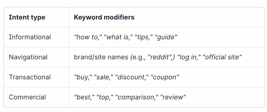 - Another way to understand the intent behind a specific query is to check the keyword modifiers. Each intent type corresponds with specific modifiers (e.g., "what" or "why" for informational intent), so look at how the keyword is structured.