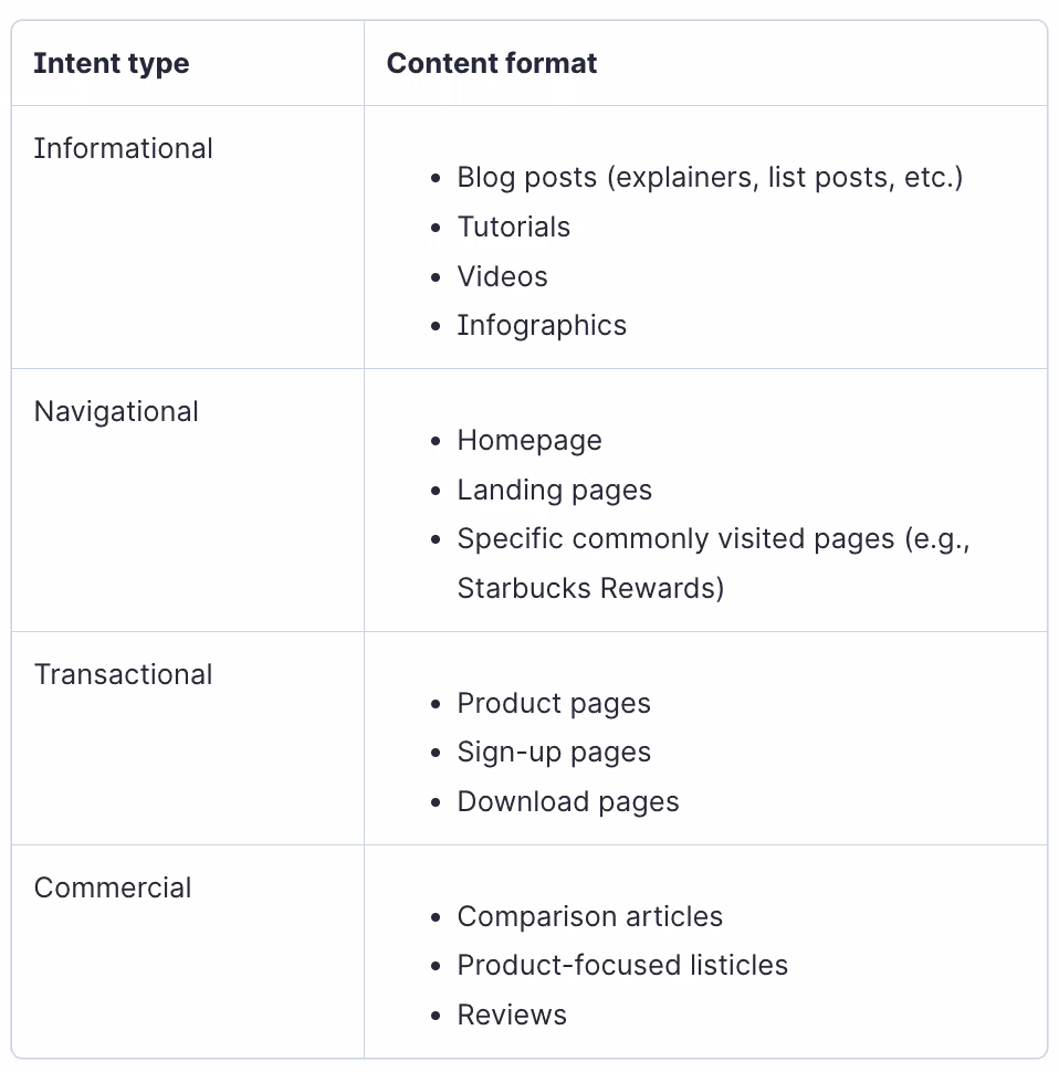 - Each content type must address a specific intent to align with Google's goal of helping users meet their search needs as quickly and effortlessly as possible.