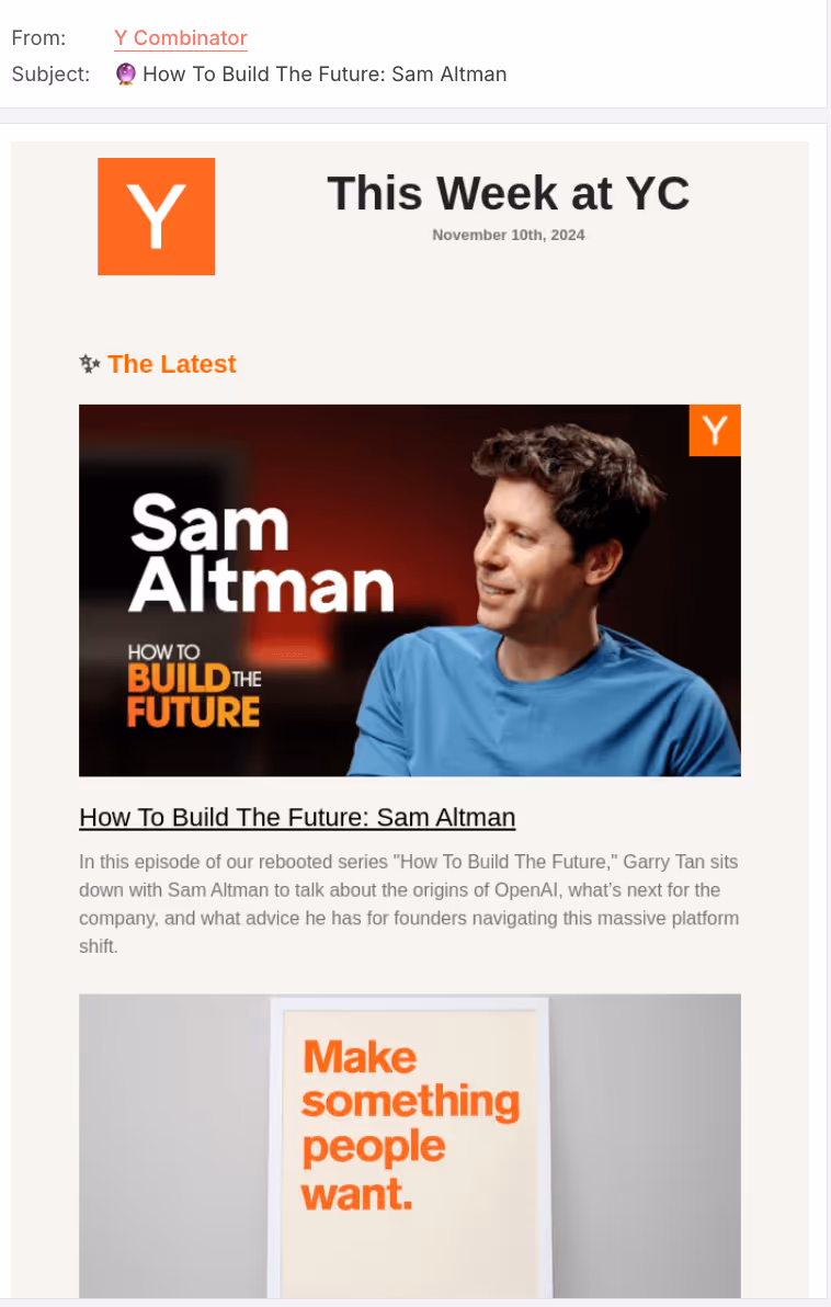This email by Y Combinator is a great example of content amplification by curating and sharing diverse high-value materials, such as interviews, blog posts, startup highlights, and news in one email. It repurposes existing content and strategically distributes it to an engaged audience, boosting its reach.