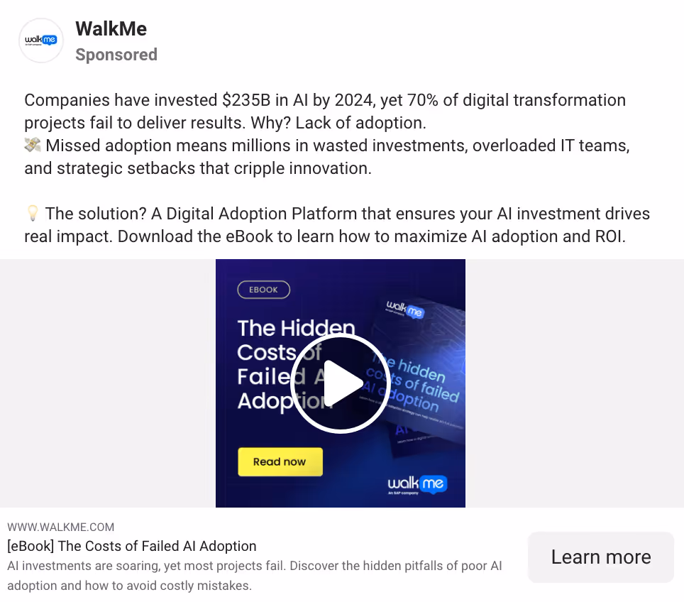 This WalkMe ad is a great example of content amplification—it uses a paid campaign to promote a downloadable eBook that addresses a timely pain point, which is AI adoption failure.