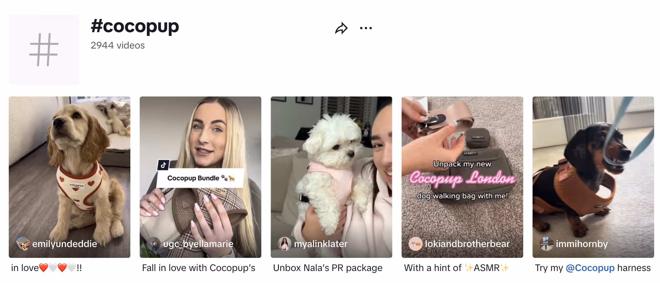 For example, Cocopup grew its TikTok visibility by encouraging customers to share videos featuring their pets using the hashtag #cocopup, turning loyal fans into content creators.