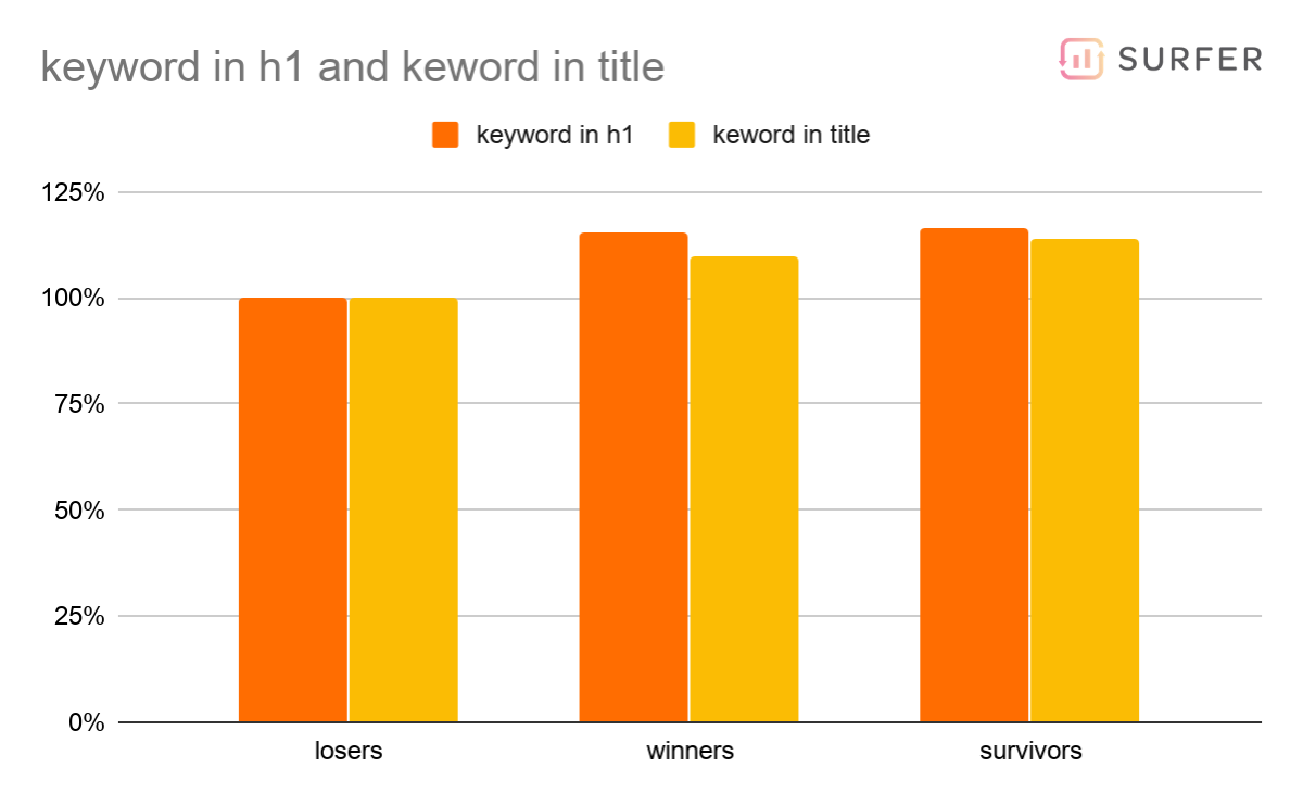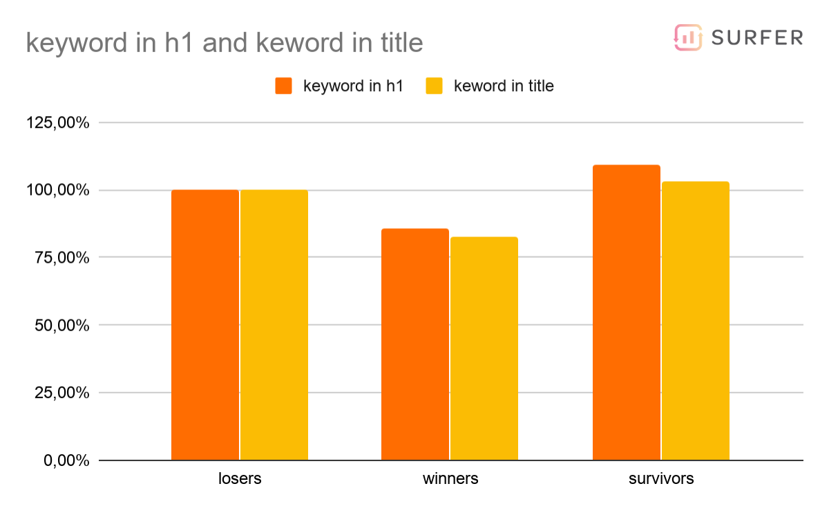 Winners do not precisely target keywords they rank for—they used exact keywords in the title less than other pages. Survivors are slightly better than losers in this area.