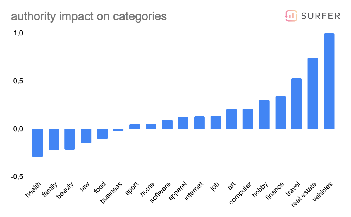 All below 0 looks like a reversed authority factor. In these categories, Google ranked more domains with lower organic traffic compared to pre-update analysis. Well, I am surprised to see health, family, beauty and law and food here.