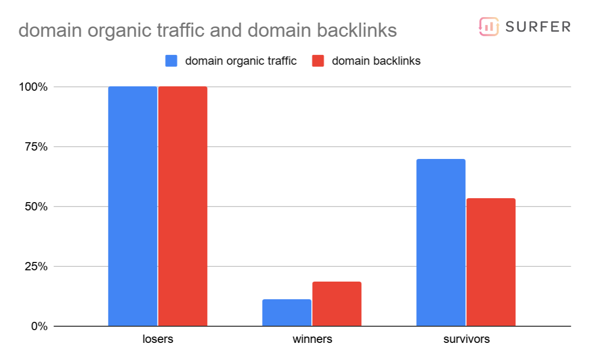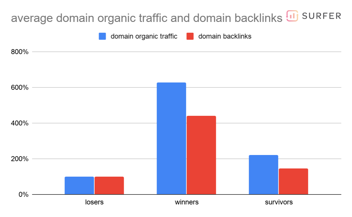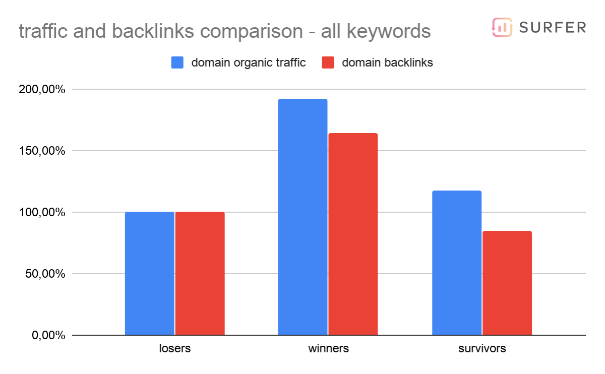 Pages that recorded the biggest wins have more trust in general. That means, they are bigger, they have more traffic, and more backlinks than survivors and losers.