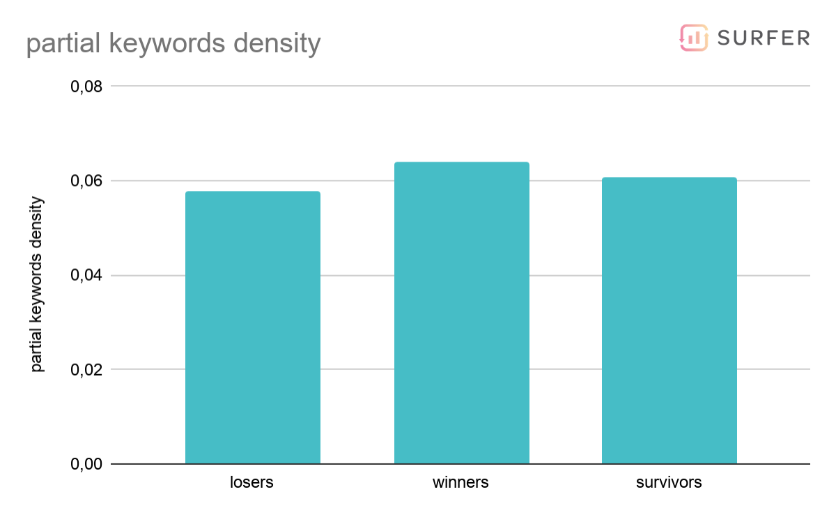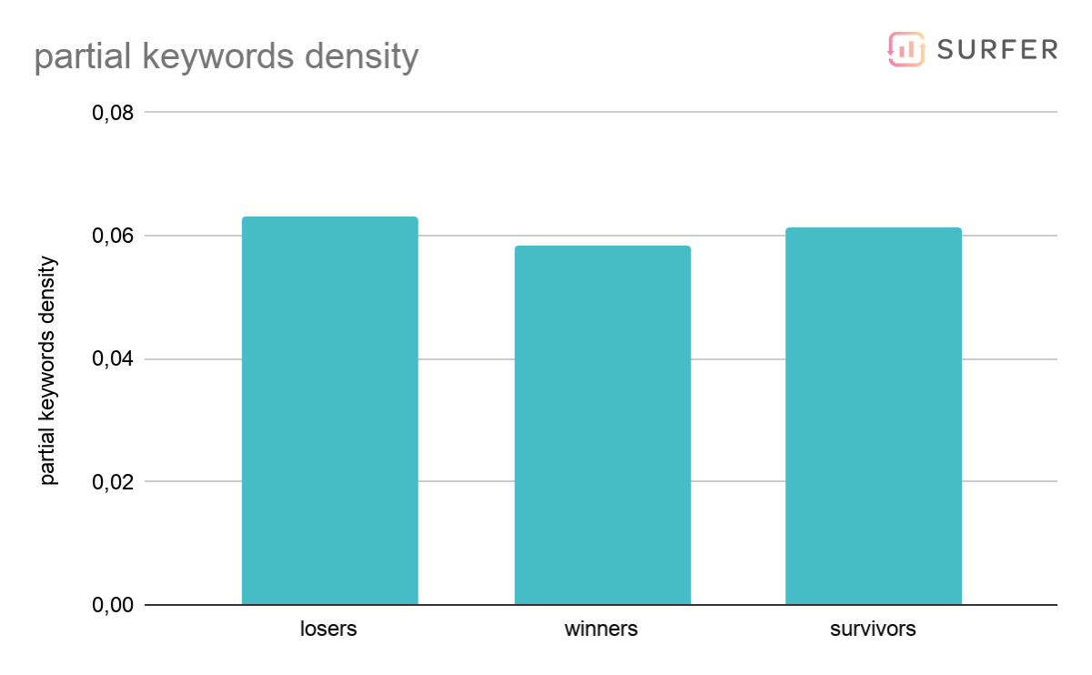 According to the chart, pages that outranked previously ranking pages use partial keywords a bit more often. Is the difference significant? I’ll leave it for you to judge.
