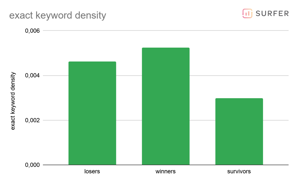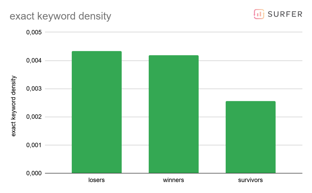 We can observe a slightly different situation in exact keywords. Survivors still have lower keyword density, but winners have 10% higher density than pages that losers!