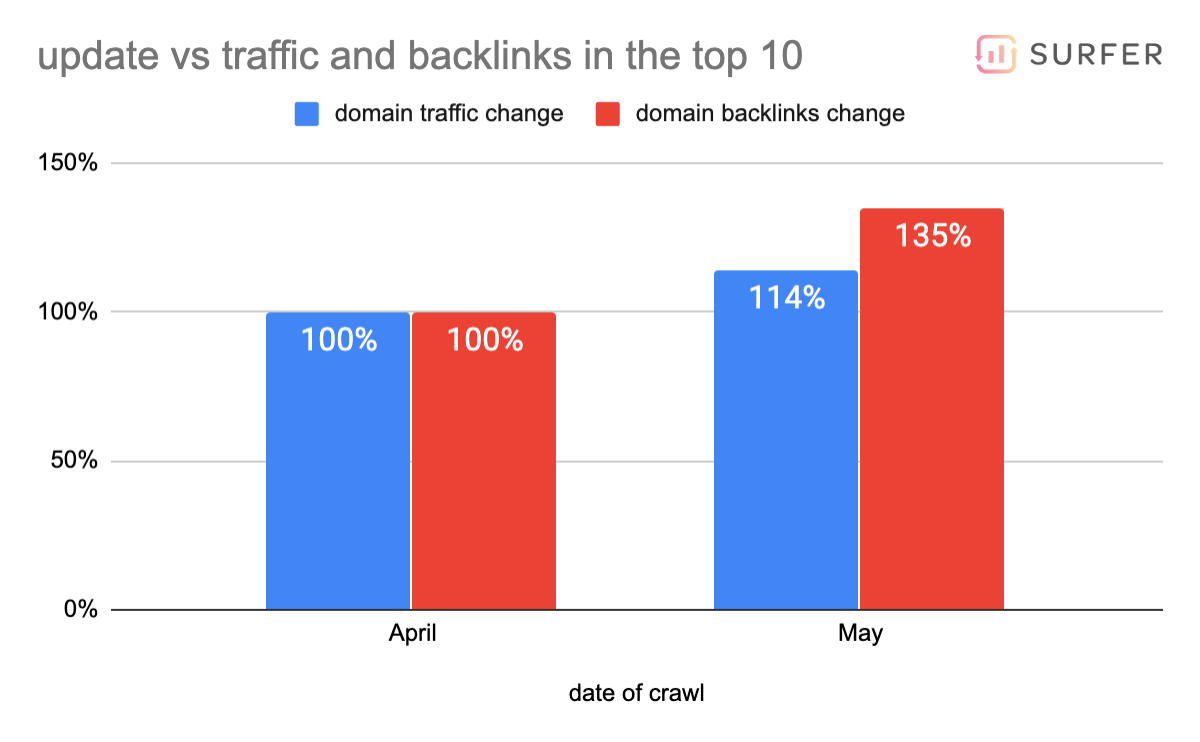 From this chart, you can clearly see that after the update, SERPs are populated by pages with more backlinks (by 35%) and more traffic (by 14%).