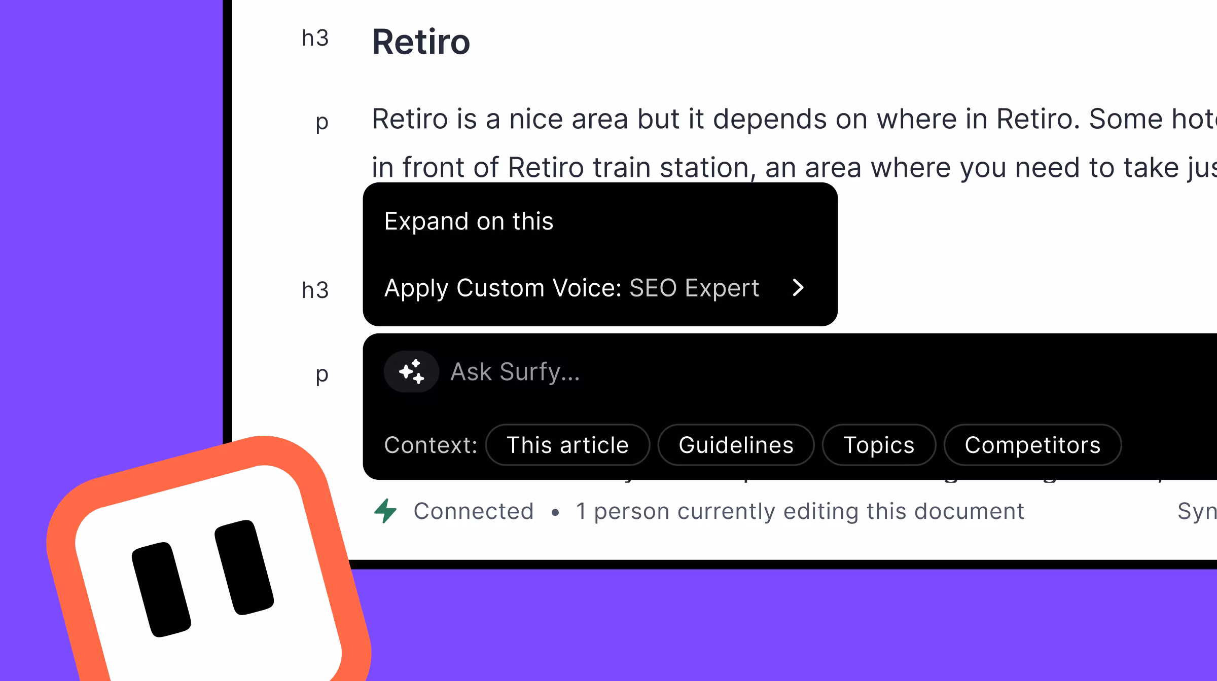 With Brand Knowledge, you can now teach Surfer about your business so every AI-powered feature — from Auto-Optimize to Surfy — writes with your brand in mind.