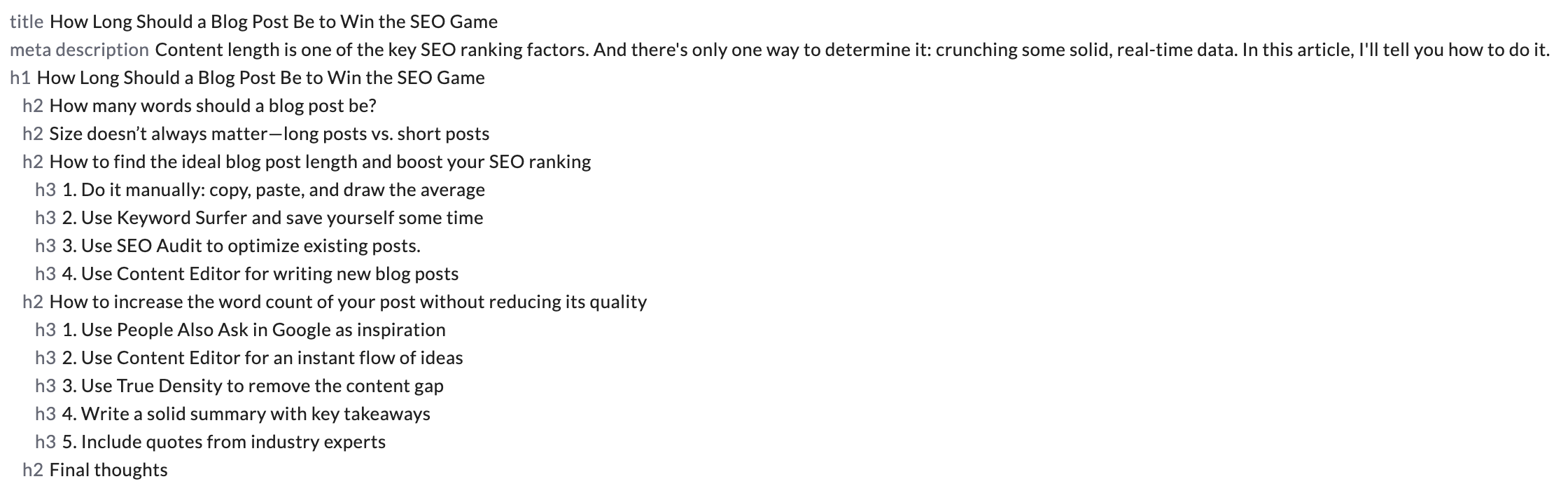 You can check content structure like this with Surfer's SERP Analyzer. Just create a query and click "Explore text of important elements" next to your page: