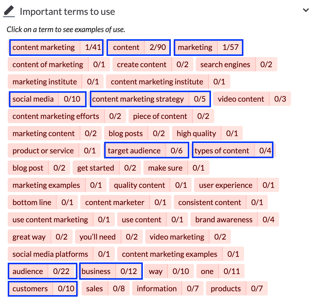 For the "content marketing" keyword, there are some words and phrases that should appear more often than others, like content (90 times), marketing (57 times), audience (22 times), and others.