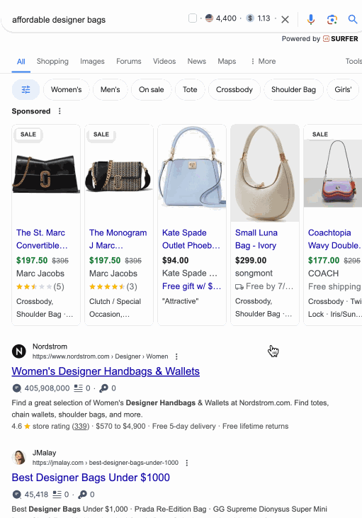 For example, if someone searches for "affordable designer bags", the SERP will display product roundups of affordable bag options.